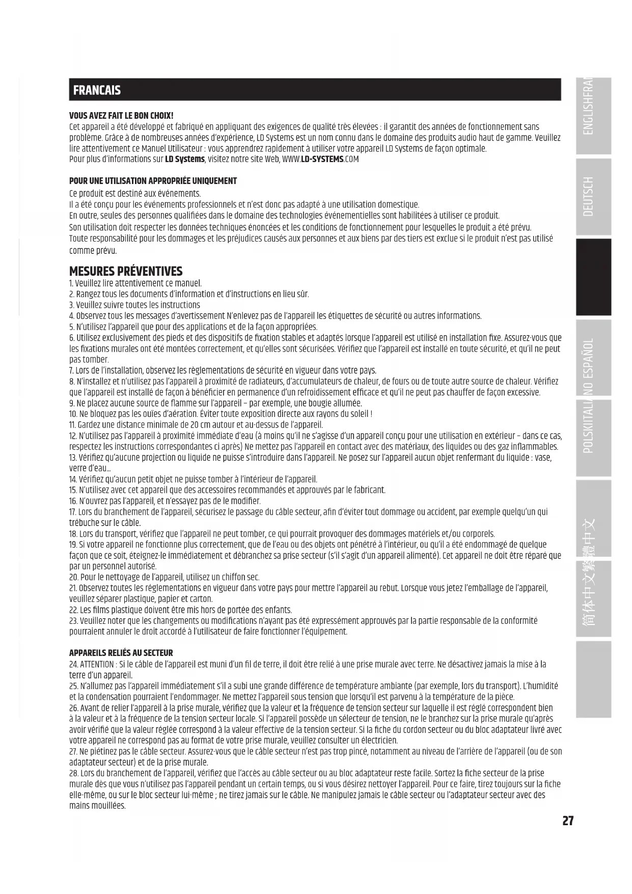 QUE SIGNIFIE L'APPELLATION DSP LECC LD SYSTEMS? DSP est l'abréviation de Digital Signal Processing (traitement numérique des signaux) et LECC de Limiter, EQ, Compressor et Crossover (limiteur, éga- liseur, compresseur et ltre répartiteur). Le traitement numérique des signaux garantit une reproduction audio optimale avec une clarté maximale et protège en même temps le système de sonorisation des surcharges. QU'ACCOMPLIT PRÉCISÉMENT LE MODULE DSP LECC? La fonction limiteur protège les haut-parleurs et évite les distorsions causées par les surcharges. Des limiteurs distincts pour les basses, les médi- ums et les aigus atténuent le signal dès que la valeur dépasse un niveau donné, potentiellement dommageable. Chaque limiteur est optimisé pour l'une des trois plages de fréquences adjacentes (limiteur multibande). De cette façon, le système peut fonctionner avec une pression acoustique globalement plus élevée car les crêtes extrêmes du signal sont automatiquement atténuées de sorte que le volume général n'ait pas à être réduit. L'égaliseur multibande intervient sur l'ensemble de la plage de fréquences pour optimiser la sonorité globale du système. Le compresseur est automatiquement désactivé pour amplier les basses et ainsi obtenir un son plus puissant. Lorsque le volume est plus élevé, le boost des basses est automatiquement réduit. Les basses réglées automatiquement de cette manière s'intègrent de manière optimale dans la sonorité globale. Les ltres répartiteurs répartissent le signal audio selon la plage de fréquences des haut-parleurs concernés, c'est-à-dire du caisson de graves ou des enceintes médiums et des tweeters de la colonne array. L'optimisation de l'amplitude et de la durée de fonctionnement des ltres répartiteurs garantit en outre une restitution homogène et simultanée de toutes les fréquences.36 DEUTSCHENGLISH FRANCAIS ESPAÑOL POLSKI ITALIANO