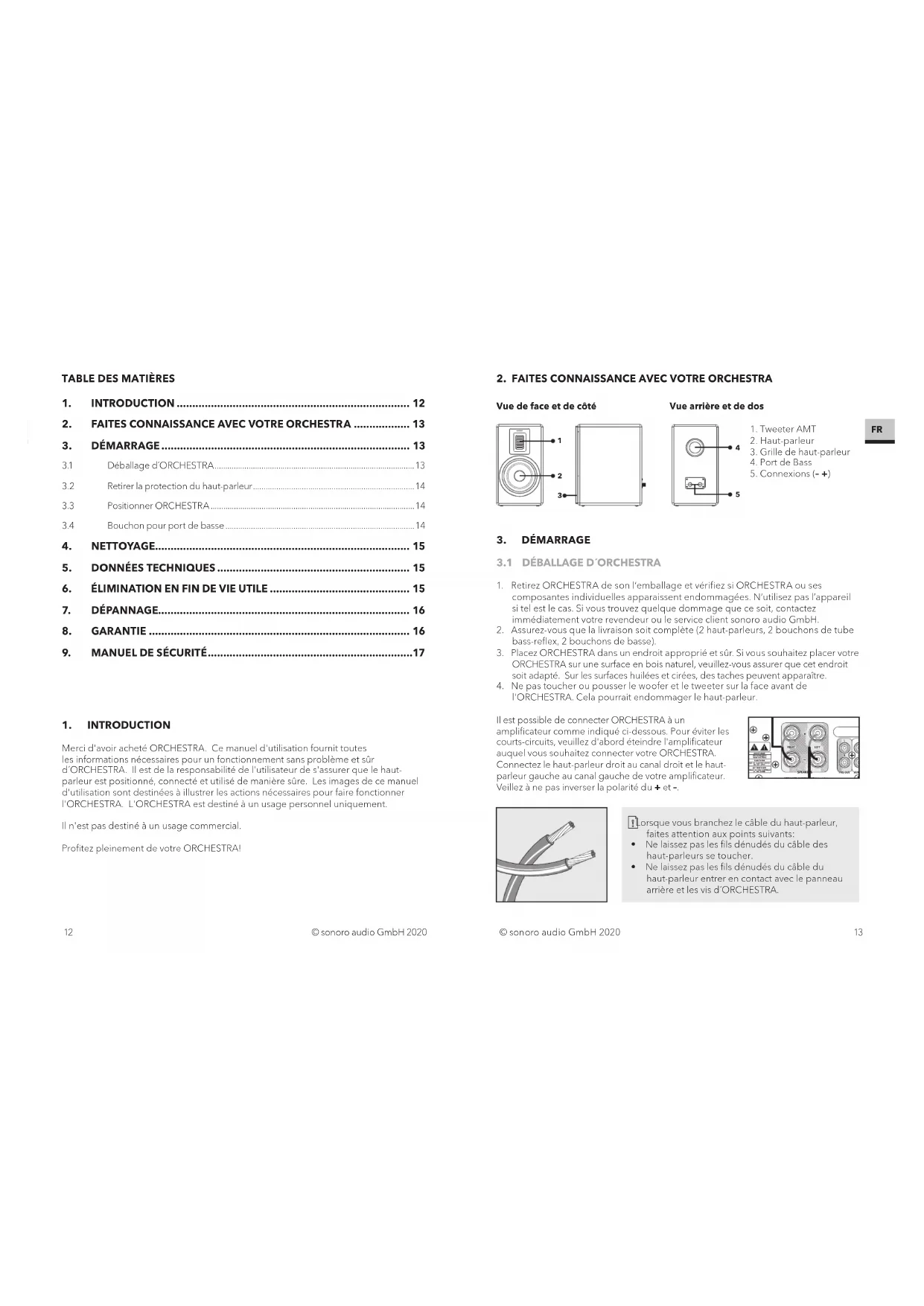 - Ne laissez pas les fils dénudés du câble du haut-parleur entrer en contact avec le panneau arrière et les vis d´ORCHESTRA. © sonoro audio GmbH 2020 13© sonoro audio GmbH 202012