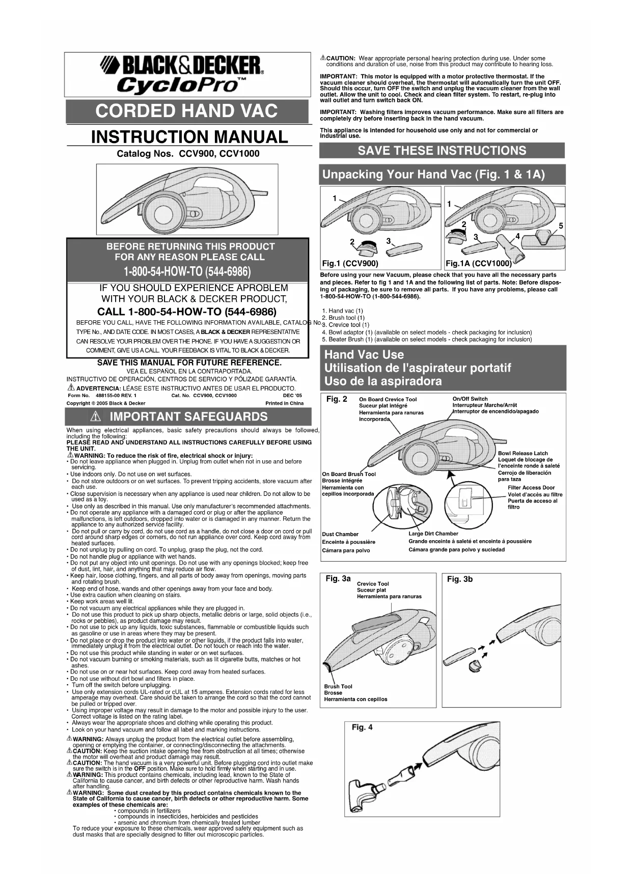 Déballage de votre aspirateur portatif (Fig. 1) Utilisation des accessoires Nettoyage de l'aspirateur portatif Le cordon d’alimentation est enroulé autour de l'appareil, ce qui permet de le ranger (se reporter à la fig. 8). Soulever le loquet de retenue du cordon et enrouler le cordon. Ànoter : enfoncer le loquet de retenue au ras de l'appareil lorsqu'il n'est pas utilisé pourretenir le cordon. DIRECTIVES DE SÉCURITÉ : FICHES POLARISÉESPour réduire le risque de chocs électriques, cet équipement comporte une fiche polarisée(une broche est plus large que l’autre). Les connexions polarisées ne peuvent être utiliséesque dans un sens. Si la fiche du cordon d’alimentation rentre mal dans la prise, inverser lafiche. Si cela ne fonctionne pas, communiquer avec un électricien professionnel pour qu’ilinstalle une prise appropriée. Ne modifier en aucune façon le cordon d’alimentation del’aspirateur.FILTRE DE RECHANGELes filtres de rechange peuvent être achetés auprès de votre centre de réparation Black & Decker ou d’un détaillant. Utiliser uniquement des pièces de rechange authen- tiques Black & Decker pour votre aspirateur.ENTRETIEN IMPORTANT : DÉBRANCHER L’ASPIRATEUR AVANT D’EFFECTUER TOUT ENTRETIEN. Utiliser uniquement un savon doux et un chiffon humecté pour nettoyer l’aspirteur. Ne jamais laisser de liquide pénétrer dans l’aspirateur et n’immerger aucune de ses parties dans un liquide. Remarque : S ’assurer que l’aspirateur est complètement sec avant de l ’utiliser. IMPORTANT Pour garantir la sécurité et la fiabilité du produit, les réparations, l’entretien et les réglages (autres que ceux indiqués dans ce manuel) doivent être réalisés par un centre de répara-tion autorisé ou tout autre centre de réparation professionnel, et les des pièces derechange identiques doivent être utilisées.INFORMATION SUR LES RÉPARATIONSBlack & Decker dispose d’un réseau complet de centres de réparation et de centres autorisés situés partout en Amérique du Nord. Tous les centres de service Black & Decker sont dotés de personnel qualifié en matière d’outillage électrique; ils sont donc en mesure d'offrir à leur clientèle un service efficace et fiable. Que vous ayez besoin d’un avis technique, d’une réparation ou de pièces de rechange authentiques installées en usine,communiquez avec l’établissement Black & Decker le plus près de chez vous. Pour trouverle centre de réparation de votre région, consultez le répertoire des pages jaunes à larubrique « Outils électriques » ou composez le numéro suivant : 1-800-54-HOW-TO (1-800-544-6986).GARANTIE COMPLÈTE DE DEUX ANS POUR UNE UTILISATION DOMESTIQUEBlack & Decker (É.-U.) Inc. garantit ce produit pour une durée de deux ans contre toutdéfaut de matériau ou de fabrication. Le produit défectueux sera remplacé ou réparé sansfrais d’une des deux façons suivantes :La première façon consiste en un échange chez le détaillant où le produit a été acheté (à la condition que le magasin soit un détaillant participant). Tout retour doit se faire durant la période correspondant à la politique d'échange du détaillant (habituellement, de 30 à 90 jours après l’achat). Une preuve d’achat peut être requise. Vérifier auprès du détaillant pour connaître sa politique concernant les retours hors de la période définie pour les échanges. La deuxième option est d’apporter ou d’envoyer le produit (transport payé d'a- vance) à un centre de réparation autorisé ou à un centre de service de Black & Deckerpour faire réparer ou échanger le produit, à notre discrétion. Une preuve d’achat peut êtrerequise. Les centres de réparation autorisés ou appartenant à Black & Decker sont réper-toriés dans les Pages jaunes sous la rubrique « Outils électriques » du bottin téléphonique.Cette garantie ne s’applique pas aux accessoires. Cette garantie vous accorde des droits légaux spécifiques et vous pourriez avoir d’autres droits qui varient d’un État ou d'une province à l'autre. Si vous avez des questions, communiquez avec le directeur du centrede réparation Black & Decker le plus près de chez vous.Ce produit n’est pas destiné à un usage commercial. Remplacement gratuit des étiquettes d’avertissement : Si vos étiquettes d’avertissement deviennent illisibles ou sont manquantes, composez le 1 (800) 544-6986 pour faire remplacer gratuitement vos étiquettes.NUMÉROS DE BREVET : 6,231,645 et 6,874,197 Rangement Fiche polarisée Pièces de rechange et entretien Importé parBlack & Decker Canada Inc.100 Central Ave.Brockville (Ontario) K6V 5W6Voir la rubrique “Outils électriques”des Pages Jaunespour le service et les ventes. Aspiradora manual con cable CONSERVE ESTE MANUAL PARA FUTURAS CONSULTAS. N° de catálogo CCV900, CCV1000