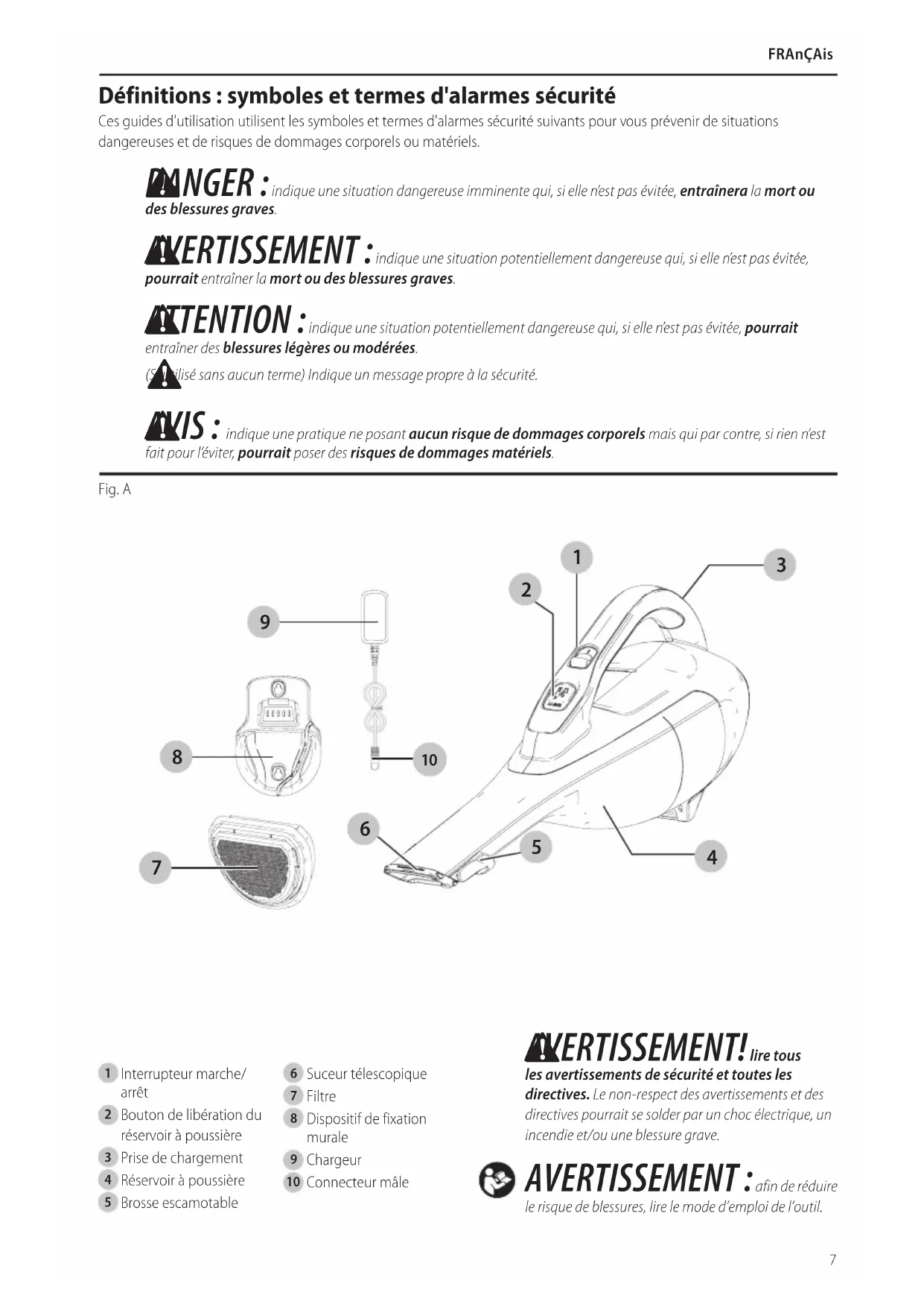 Interrupteur marche/arrêt Bouton de libération du réservoir à poussière Prise de chargement Réservoir à poussière Brosse escamotable Suceur télescopique Filtre Dispositif de fixation murale Chargeur Connecteur mâle Français (traduction de la notice d’instructions originale) Fig. A