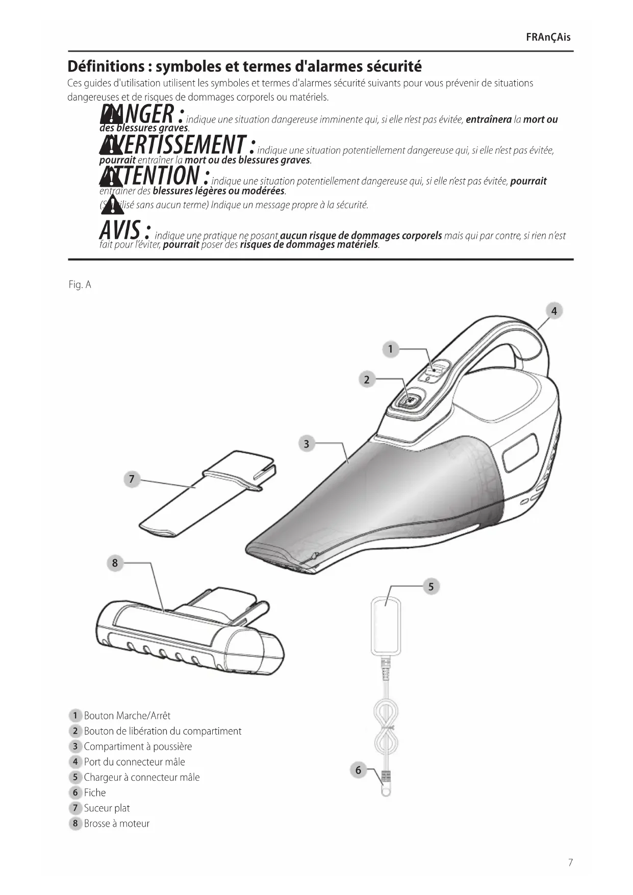 Nettoyer le compartiment à poussière et le filtre Le compartiment à poussière et le filtre peuvent être lavés dans de l’eau tiède et savonneuse.1. Assurez-vous que le filtre et le compartiment à poussière sont secs avant de les réinstaller. Accessoires (Fig. L) Votre aspirateur portatif peut être offert avec certains des accessoires suivants: - Un suceur plat pour les espaces restreints. - Une brosse à moteur pour un ramassage facile des débris. Ajustement 1. Insérez l’accessoire approprié à l’avant de l’appareil comme illustré dans la Figure F.2. Assurez-vous que l’accessoire est complètement enfoncé.