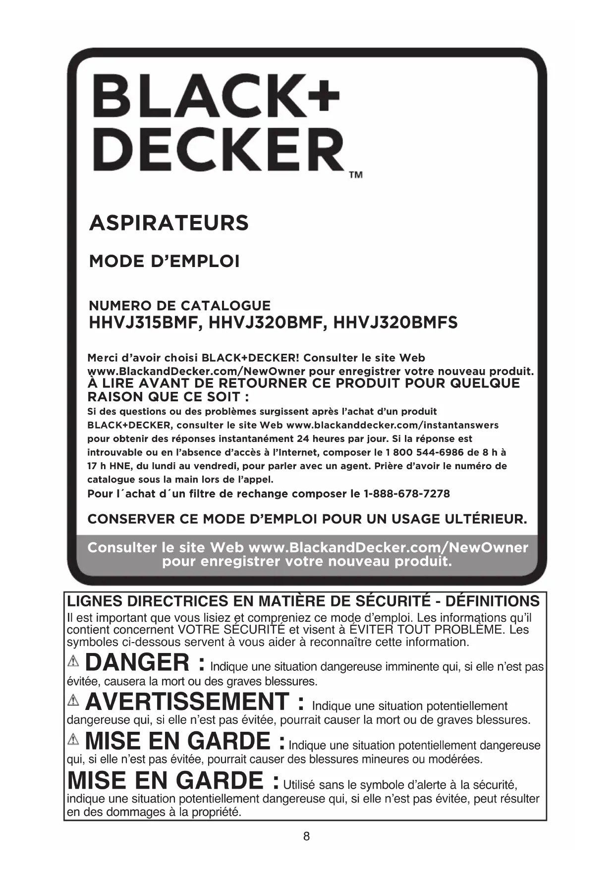 ASPIRATEURS Merci d’avoir choisi BLACK+DECKER! Consulter le site Web www.BlackandDecker.com/NewOwner pour enregistrer votre nouveau produit.ÀLIRE AVANT DE RETOURNER CE PRODUIT POUR QUELQUE RAISON QUE CE SOIT :Si des questions ou des problèmes surgissent après l’achat d’un produit BLACK+DECKER, consulter le site Web www.blackanddecker.com/instantanswers pour obtenir des réponses instantanément 24 heures par jour. Si la réponse est introuvable ou en l’absence d’accès à l’Internet, composer le 1 800 544-6986 de 8 h à 17 h HNE, du lundi au vendredi, pour parler avec un agent. Prière d’avoir le numéro de catalogue sous la main lors de l’appel.Pour l´achat d´un filtre de rechange composer le 1-888-678-7278CONSERVER CE MODE D’EMPLOI POUR UN USAGE ULTÉRIEUR.NUMERO DE CATALOGUE