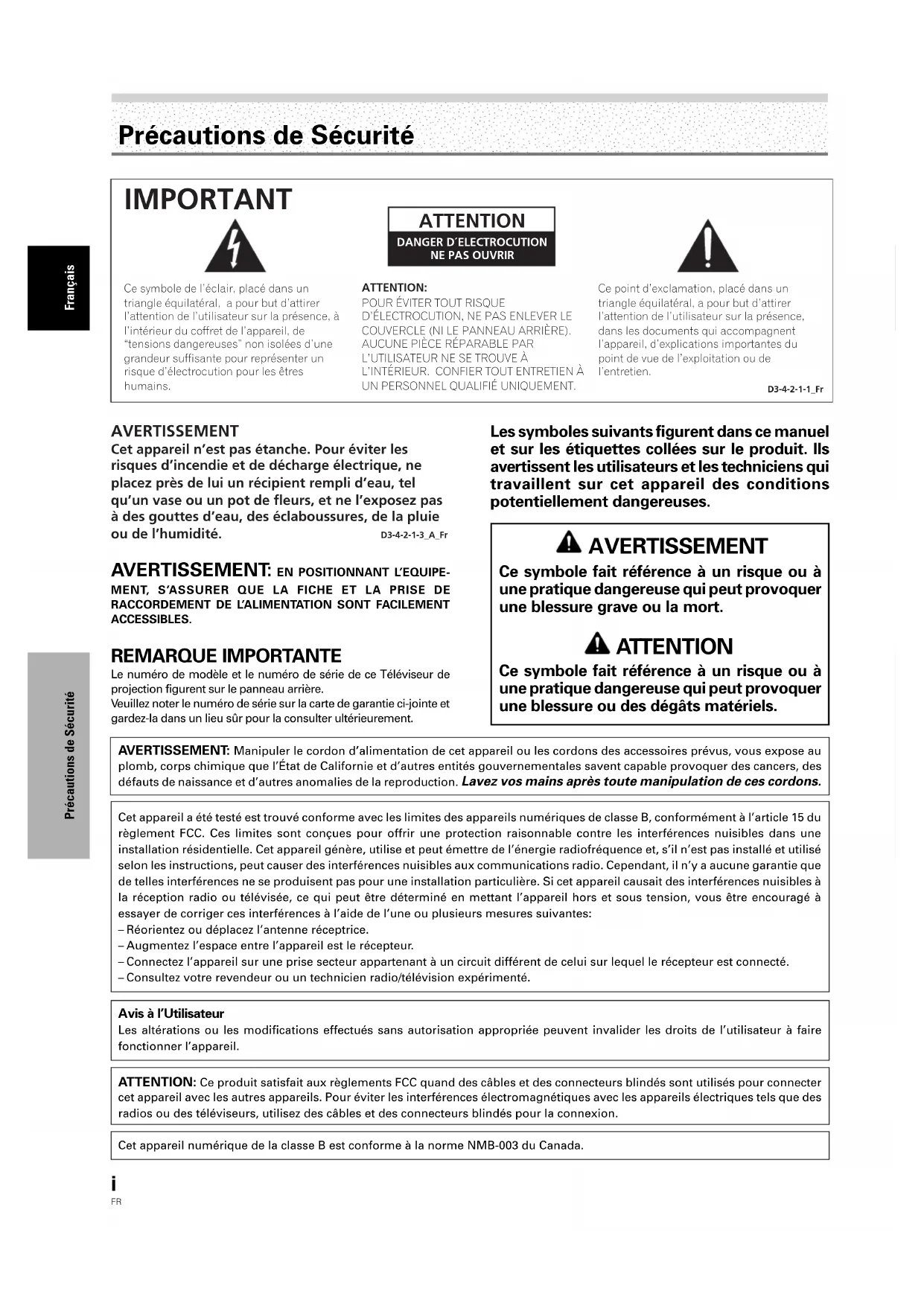 Ce point d’exclamation, placé dans un triangle équilatéral, a pour but d’attirer l’attention de l’utilisateur sur la présence, dans les documents qui accompagnent l’appareil, d’explications importantes du point de vue de l’exploitation ou de l’entretien.Ce symbole de l’éclair, placé dans un triangle équilatéral, a pour but d’attirer l’attention de l’utilisateur sur la présence, à l’intérieur du coffret de l’appareil, de “tensions dangereuses” non isolées d’une grandeur suffisante pour représenter un risque d’électrocution pour les êtres humains. IMPORTANT ATTENTION:POUR ÉVITER TOUT RISQUE D’ÉLECTROCUTION, NE PAS ENLEVER LE COUVERCLE (NI LE PANNEAU ARRIÈRE). AUCUNE PIÈCE RÉPARABLE PAR L’UTILISATEUR NE SE TROUVE À L’INTÉRIEUR. CONFIER TOUT ENTRETIEN À UN PERSONNEL QUALIFIÉ UNIQUEMENT. ATTENTION DANGER D´ELECTROCUTIONNE PAS OUVRIRD3-4-2-1-1_FrAVERTISSEMENTCet appareil n’est pas étanche. Pour éviter les risques d’incendie et de décharge électrique, ne placez près de lui un récipient rempli d’eau, tel qu’un vase ou un pot de fleurs, et ne l’exposez pas à des gouttes d’eau, des éclaboussures, de la pluie ou de l’humidité. D3-4-2-1-3_A_Fr