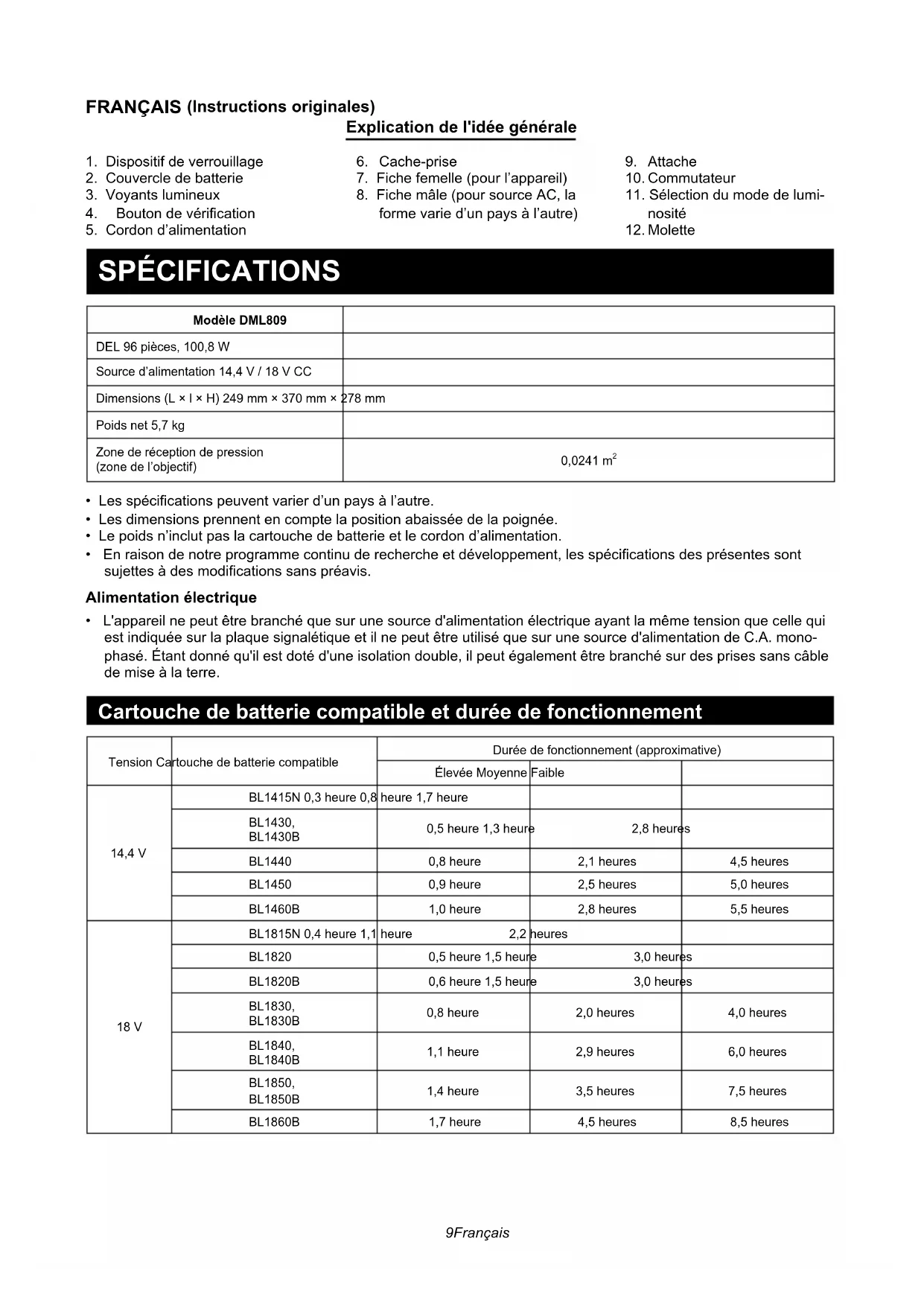 - Some items in the list may be included in the appliance package as standard accessories. They may differ from country to country.9 Français FRANÇAIS (Instructions originales) Explication de l'idée générale 1. Dispositif de verrouillage2. Couvercle de batterie3. Voyants lumineux4. Boutondevérication5. Cordon d’alimentation6. Cache-prise7. Fiche femelle (pour l’appareil)8. Fiche mâle (pour source AC, la forme varie d’un pays à l’autre)9. Attache10. Commutateur11. Sélection du mode de lumi-nosité12. Molette SPÉCIFICATIONS Modèle DML809DEL 96 pièces, 100,8 WSource d’alimentation 14,4 V / 18 V CCDimensions (L × l × H) 249 mm × 370 mm × 278 mmPoids net 5,7 kgZone de réception de pression (zone de l’objectif)0,0241 m