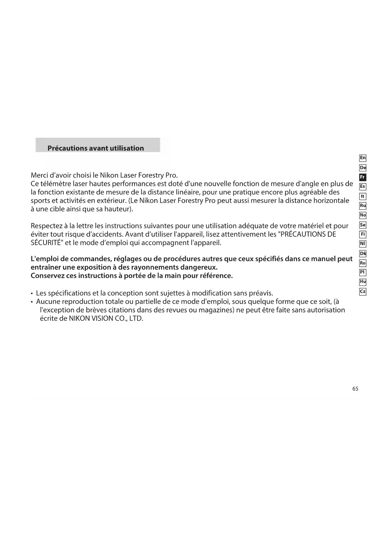 Précautions avant utilisation Merci d’avoir choisi le Nikon Laser Forestry Pro. Ce télémètre laser hautes performances est doté d'une nouvelle fonction de mesure d'angle en plus de la fonction existante de mesure de la distance linéaire, pour une pratique encore plus agréable des sports et activités en extérieur. (Le Nikon Laser Forestry Pro peut aussi mesurer la distance horizontale à une cible ainsi que sa hauteur). Respectez à la lettre les instructions suivantes pour une utilisation adéquate de votre matériel et pour éviter tout risque d'accidents. Avant d’utiliser l'appareil, lisez attentivement les "PRÉCAUTIONS DE SÉCURITÉ" et le mode d’emploi qui accompagnent l'appareil. L'emploi de commandes, réglages ou de procédures autres que ceux spécifiés dans ce manuel peut entraîner une exposition à des rayonnements dangereux. Conservez ces instructions à portée de la main pour référence.