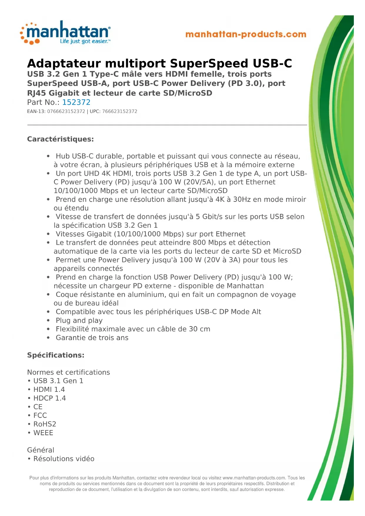 Adaptateur multiport SuperSpeed USB-C USB 3.2 Gen 1 Type-C mâle vers HDMI femelle, trois ports SuperSpeed USB-A, port USB-C Power Delivery (PD 3.0), port RJ45 Gigabit et lecteur de carte SD/MicroSD Part No.: 152372 EAN-13: 0766623152372 | UPC: 766623152372 Caractéristiques: Hub USB-C durable, portable et puissant qui vous connecte au réseau, à votre écran, à plusieurs périphériques USB et à la mémoire externe Un port UHD 4K HDMI, trois ports USB 3.2 Gen 1 de type A, un port USB- C Power Delivery (PD) jusqu'à 100 W (20V/5A), un port Ethernet 10/100/1000 Mbps et un lecteur carte SD/MicroSD Prend en charge une résolution allant jusqu'à 4K à 30Hz en mode miroir ou étendu Vitesse de transfert de données jusqu'à 5 Gbit/s sur les ports USB selon la spécification USB 3.2 Gen 1 Vitesses Gigabit (10/100/1000 Mbps) sur port Ethernet Le transfert de données peut atteindre 800 Mbps et détection automatique de la carte via les ports du lecteur de carte SD et MicroSD Permet une Power Delivery jusqu'à 100 W (20V à 3A) pour tous les appareils connectés Prend en charge la fonction USB Power Delivery (PD) jusqu'à 100 W; nécessite un chargeur PD externe - disponible de Manhattan Coque résistante en aluminium, qui en fait un compagnon de voyage ou de bureau idéal Compatible avec tous les périphériques USB-C DP Mode Alt Plug and play Flexibilité maximale avec un câble de 30 cm Garantie de trois ans Spécifications: Normes et certifications