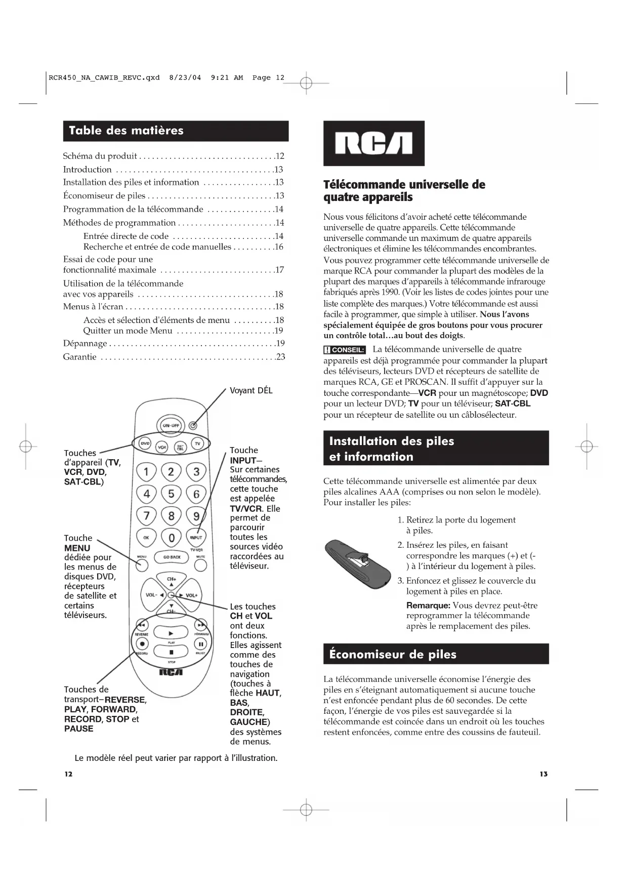 - logement à piles en place. Remarque: Vous devrez peut-être reprogrammer la télécommande après le remplacement des piles. Nous vous félicitons d’avoir acheté cette télécommande universelle de quatre appareils. Cette télécommande universelle commande un maximum de quatre appareils électroniques et élimine les télécommandes encombrantes. Vous pouvez programmer cette télécommande universelle de marque RCA pour commander la plupart des modèles de la plupart des marques d’appareils à télécommande infrarouge fabriqués après 1990. (Voir les listes de codes jointes pour une liste complète des marques.) Votre télécommande est aussi facile à programmer, que simple à utiliser. Nous l’avons spécialement équipée de gros boutons pour vous procurer un contrôle total…au bout des doigts. La télécommande universelle de quatre appareils est déjà programmée pour commander la plupart des téléviseurs, lecteurs DVD et récepteurs de satellite de marques RCA, GE et PROSCAN. Il suffit d’appuyer sur la touche correspondante—VCR pour un magnétoscope; DVD pour un lecteur DVD; TV pour un téléviseur; SAT·CBL pour un récepteur de satellite ou un câblosélecteur. Touches d’appareil (TV, VCR, DVD, SAT·CBL) Les touches CH et VOL ont deux fonctions. Elles agissent comme des touches de navigation (touches à flèche HAUT, BAS, DROITE, GAUCHE) des systèmes de menus. Touche INPUT— Sur certaines télécommandes, cette touche est appelée TV/VCR. Elle permet de parcourir toutes les sources vidéo raccordées au téléviseur. Table des matières Schéma du produit p. 12