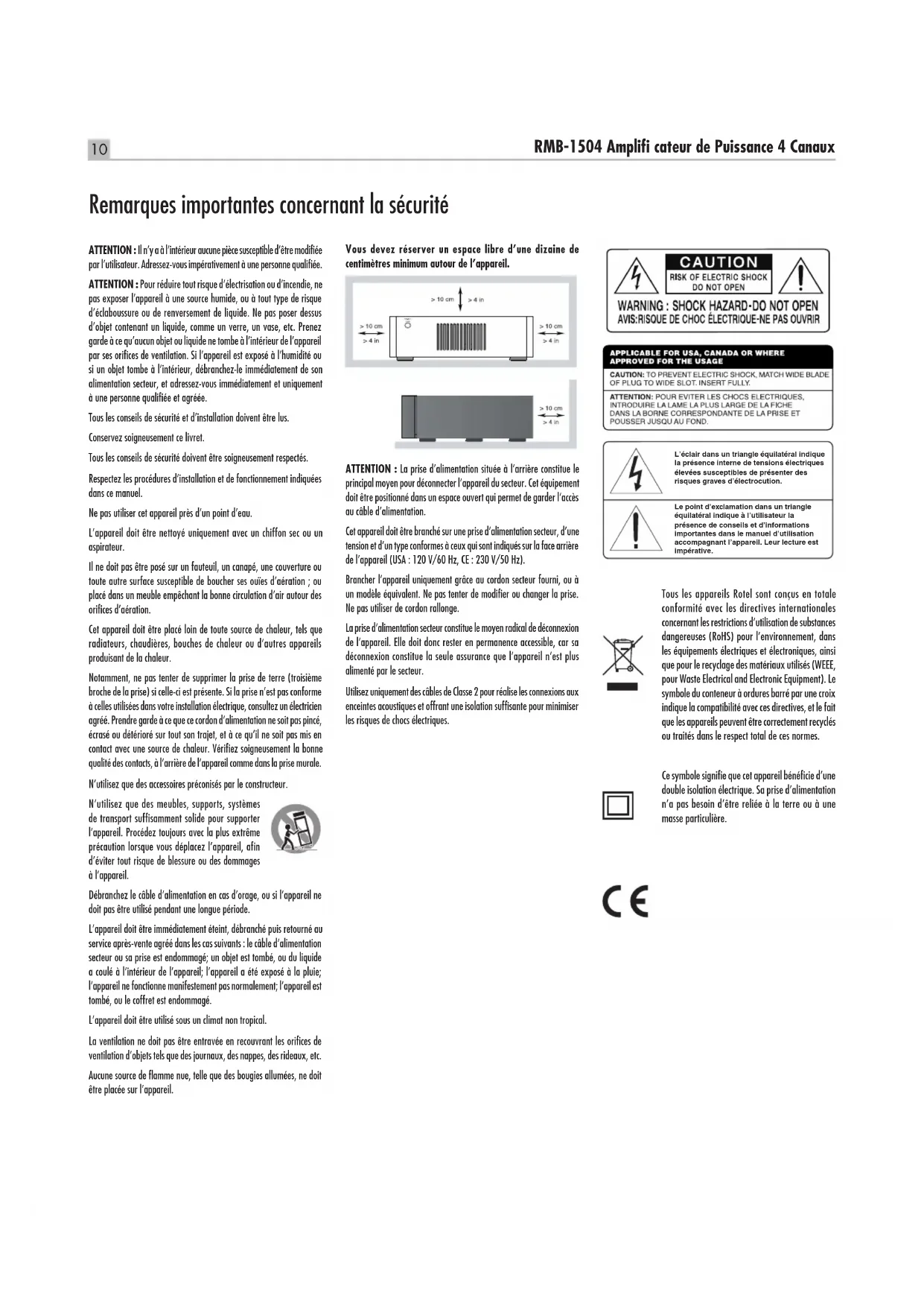 Problèmes de fonctionnement .........................................14 L’indicateur de mise sous tension n’est pas allumé 14 Pas de son 14 Indicateur de protection 14 Spécications .....................................................1512 RMB-1504 Ampli cateur de Puissance 4 Canaux fil qui puisse entrer en contact avec les autres câbles d’enceintes ou avec le châssis de l’amplificateur. Merci de lire soigneusement ce manuel. En plus de vous donner des renseignements utiles sur l’installation et la mise en œuvre de votre amplicateur, il vous apportera des informations sur les diverses congurations possibles, ainsi que des données plus générales qui vous aideront à obtenir les meilleures performances sonore de votre système. N’hésitez pas à contacter votre revendeur agréé Rotel pour obtenir les réponses à toutes les questions que vous pourriez vous poser. En outre, nous sommes toujours heureux, chez Rotel, de recevoir toutes vos remarques et commentaires. Conservez soigneusement le carton ainsi que les éléments servant à l’emballage pour un usage futur éventuel. En effet, expédier ou déménager l’amplicateur dans quoique ce soit d’autre que son carton d’origine peut avoir pour conséquence d’endommager gravement votre appareil et qui ne serait pas converte par la garantie. Si inclus dans la boîte, veuillez compléter la carte d’enregistrement du propriétaire ou vous inscrire en ligne, et conservez en lieu sûr la facture originale. Elle constitue votre meilleure preuve de date d’achat au cas où vous auriez besoin de faire appliquer la garantie constructeur. Installation Le RMB-1504 génèrent de la chaleur pendant leur fonctionnement normal. Les ouïes de refroidissement et la ventilation interne de l’amplicateur sont conçues pour dissiper la chaleur. Les ouïes de refroidissement sur le dessus de l’appareil doivent rester libres. Il doit y avoir environ 10 cm de dégagement tout autour de lui pour permettre le bon fonctionnement de sa ventilation et une bonne circulation d’air tout autour du meuble qui le supporte pour éviter toute surchauffe à l’amplicateur. Prenez en compte le poids et les dimensions de l’appareil lorsque vous le disposez sur une étagère, un meuble ou dans un rack, et vériez que ceux ci sont bien en mesure de supporter son poids. Nous vous conseillons de disposer l’appareil dans un meuble conçu pour intégrer des éléments audio domestiques. De tels meubles sont spécialement fabriqués pour réduire ou supprimer les vibrations qui peuvent affecter la qualité sonore. Prenez conseil auprès de votre revendeur agréé Rotel sur un choix de meuble et pour une installation correcte de vos éléments audio. Alimentation secteur et commandes Prise secteur