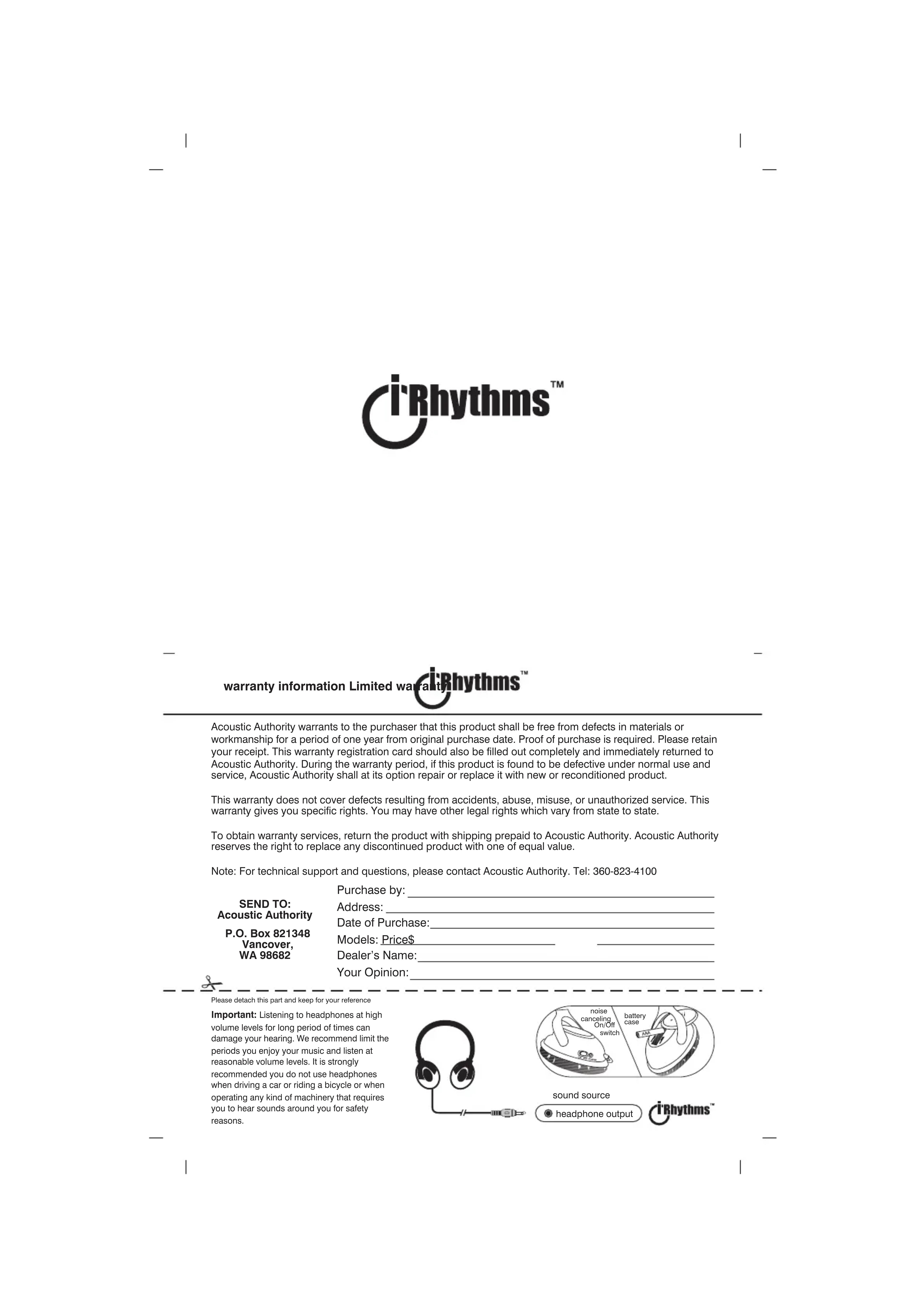 Purchase by: Address: Date of Purchase: Models: Price$ Dealers Name: Your Opinion: Please detach this part and keep for your reference noisecanceling On/Off switchbattery case headphone output sound source Acoustic Authority warrants to the purchaser that this product shall be free from defects in materials or workmanship for a period of one year from original purchase date. Proof of purchase is required. Please retain your receipt. This warranty registration card should also be filled out completely and immediately returned to Acoustic Authority. During the warranty period, if this product is found to be defective under normal use and service, Acoustic Authority shall at its option repair or replace it with new or reconditioned product. This warranty does not cover defects resulting from accidents, abuse, misuse, or unauthorized service. This warranty gives you specific rights. You may have other legal rights which vary from state to state. To obtain warranty services, return the product with shipping prepaid to Acoustic Authority. Acoustic Authority reserves the right to replace any discontinued product with one of equal value. Note: For technical support and questions, please contact Acoustic Authority. Tel: 360-823-4100 warranty information Limited warranty Important: Listening to headphones at high volume levels for long period of times candamage your hearing. We recommend limit theperiods you enjoy your music and listen atreasonable volume levels. It is stronglyrecommended you do not use headphoneswhen driving a car or riding a bicycle or whenoperating any kind of machinery that requiresyou to hear sounds around you for safetyreasons. SEND TO: Acoustic Authority P.O. Box 821348 Vancover, WA 98682ENVOYER A : Acoustic Authority P.O. Box 821348 Vancover, WA 98682 Veuillez détacher cette partie et la conserver pour information interrupteur Marche/Arrêt du systèm e antibruitcompartiment à piles sortie casque entrée son Acoustic Authority garantit ce produit contre tout défaut de matière et de fabrication, et ce pendant une période d'un an à compter de la date d'achat originelle. Un justificatif d'achat sera demandé ; veuillez conserver votre ticket de caisse. Cette fiche de garantie devra être remplie et renvoyée immédiatement à Acoustic Authority. Si, pendant la période de garantie, ce produit s'avère défectueux en conditions d'utilisation normales, Acoustic Authority le réparera ou, à son appréciation, le remplacera par un produit neuf ou reconditionné. Cette garantie ne s'applique pas aux défauts résultant d'accidents, d'un abus ou d'une utilisation non conforme ou d'une intervention non autorisée. Cette garantie vos confère des droits spécifiques. Vous possédez peut-être d'autres droits qui, eux, varient selon les états. Pour toute intervention sous garantie, retournez le produit à Acoustic Authority en port payé. Acoustic Authority se réserve le droit de remplacer tout produit en fin de série par un produit d'une valeur égale. Remarque : Pour toute assistance technique ou question, veuillez contacter Acoustic Authority. Tél. : 360-823-4100 informations sur la garantie Garantie limitée Important : L'utilisation d'un casque à un niveau de volume élevé pendant de longues périodes peutendommager l'ouïe. Nous vous conseillons de limiterles périodes d'écoute de votre musique et de respecterun niveau de volume raisonnable. Il est fortementdéconseillé d'utiliser un casque au volant ou à bicyclette,ou aux commandes d'une machine quelconque dontle fonctionnement nécessite, pour des raisons desécurité, l'audition des sons environnants parl'opérateur. Nom de l'acheteur : Adresse : Date d'achat : Modèle : Prix $ Nom du revendeur : Votre opinion :
