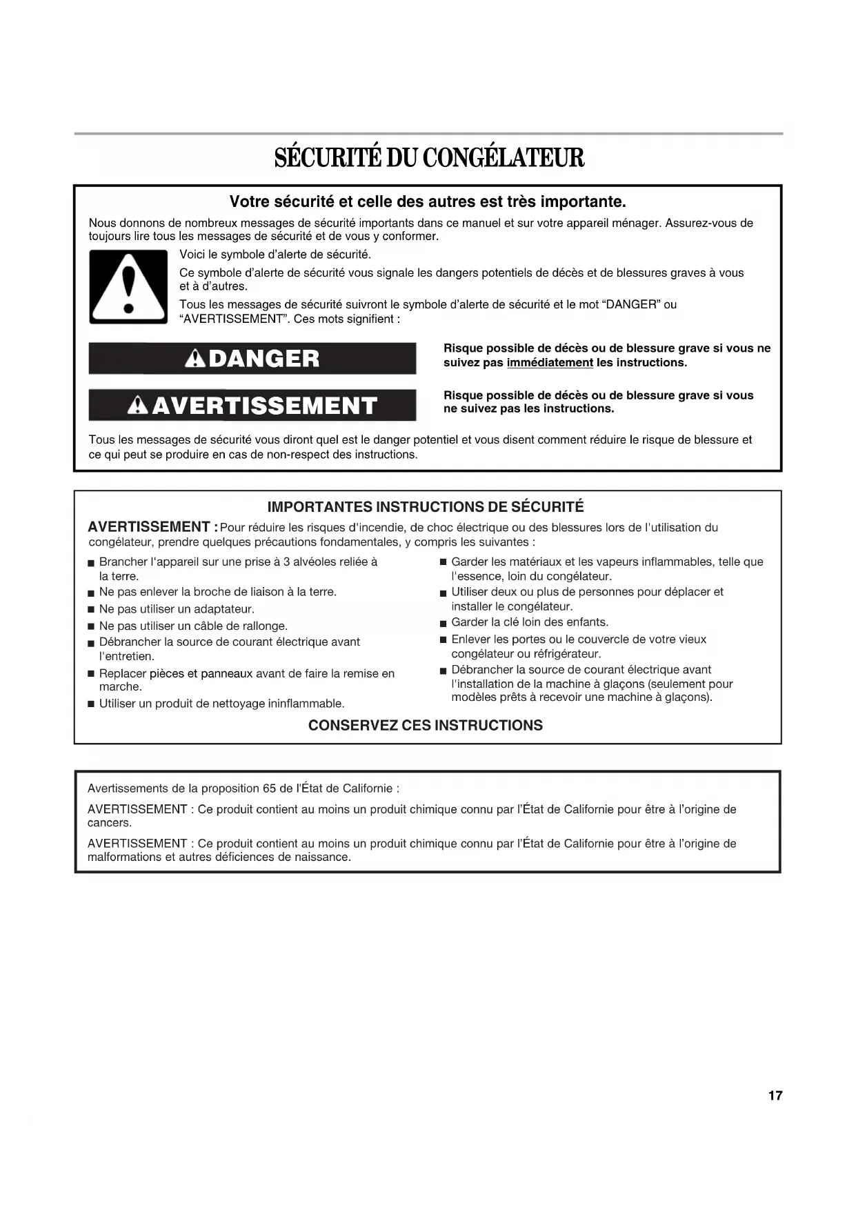 Brancher l'appareil sur une prise à 3 alvéoles reliée à la terre. Ne pas enlever la broche de liaison à la terre. Ne pas utiliser un adaptateur. Ne pas utiliser un câble de rallonge. Débrancher la source de courant électrique avant l'entretien. Replacer pièces et panneaux avant de faire la remise en marche. Utiliser un produit de nettoyage ininflammable. Garder les matériaux et les vapeurs inflammables, telle que l'essence, loin du congélateur. Utiliser deux ou plus de personnes pour déplacer et installer le congélateur. Garder la clé loin des enfants. Enlever les portes ou le couvercle de votre vieux congélateur ou réfrigérateur. Débrancher la source de courant électrique avant l'installation de la machine à glaçons (seulement pour modèles prêts à recevoir une machine à glaçons).Avertissements de la proposition 65 de l'État de Californie :