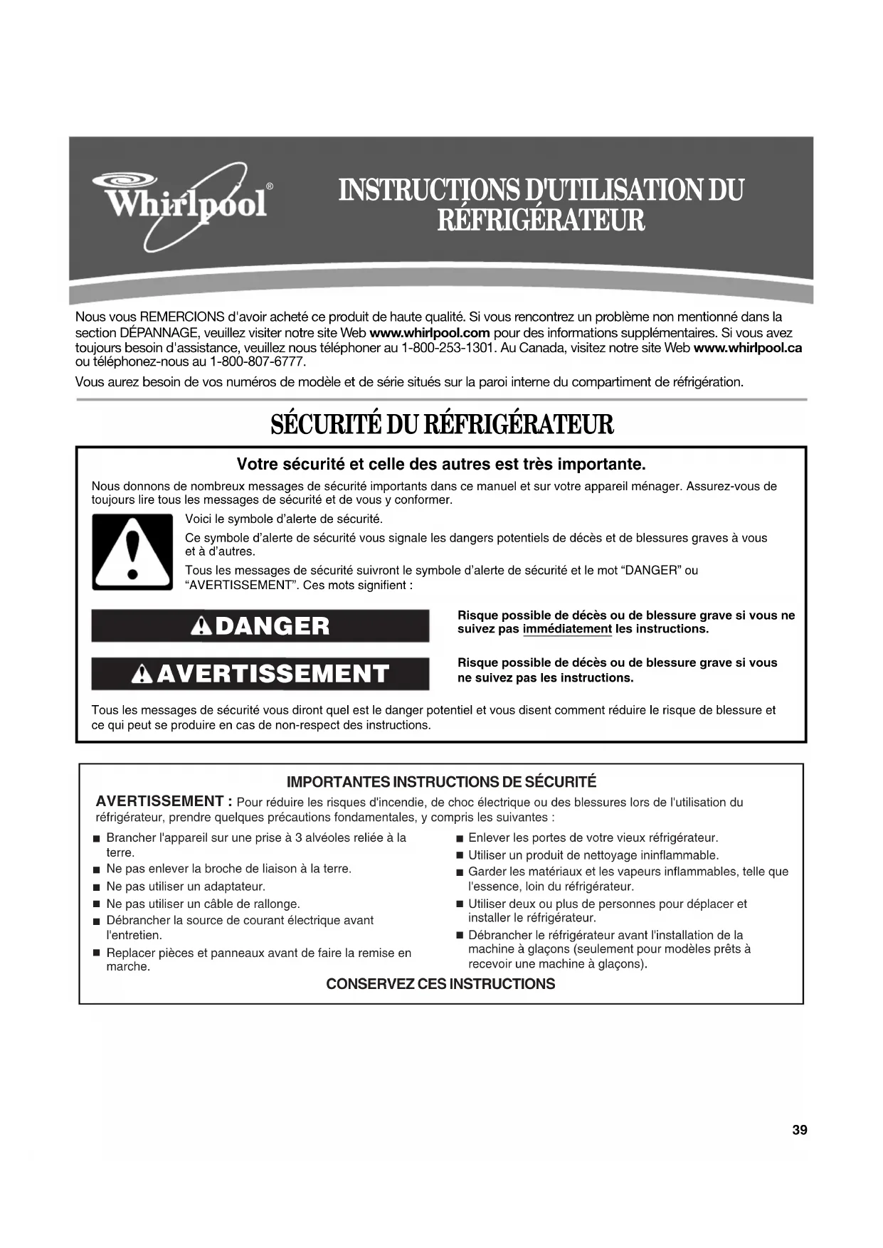 9. Les frais de transport pour le service d'un produit si votre gros appareil est situé dans une région éloignée où un service d’entretien Whirlpool autorisé n’est pas disponible. 10. La dépose et la réinstallation de votre gros appareil si celui-ci est installé dans un endroit inaccessible ou n'est pas installé conformément aux instructions d'installation fournies. 11. Les gros appareils ménagers dont les numéros de série et de modèle originaux ont été enlevés, modifiés ou qui ne peuvent pas être facilement identifiés. La présente garantie est nulle si le numéro de série d’usine a été modifié ou enlevé du gros appareil ménager. Le coût d’une réparation ou des pièces de rechange dans le cadre de ces circonstances exclues est à la charge du client. CLAUSE D'EXONÉRATION DE RESPONSABILITÉ AU TITRE DES GARANTIES IMPLICITES; LIMITATION DES RECOURS LE SEUL ET EXCLUSIF RECOURS DU CLIENT DANS LE CADRE DE LA PRÉSENTE GARANTIE LIMITÉE CONSISTE EN LA RÉPARATION PRÉVUE CI-DESSUS. LES GARANTIES IMPLICITES, Y COMPRIS LES GARANTIES APPLICABLES DE QUALITÉ MARCHANDE ET D'APTITUDE À UN USAGE PARTICULIER, SONT LIMITÉES À UN AN OU À LA PLUS COURTE PÉRIODE AUTORISÉE PAR LA LOI. WHIRLPOOL N'ASSUME AUCUNE RESPONSABILITÉ POUR LES DOMMAGES FORTUITS OU INDIRECTS. CERTAINES JURIDICTIONS NE PERMETTENT PAS L'EXCLUSION OU LA LIMITATION DES DOMMAGES FORTUITS OU INDIRECTS, OU LES LIMITATIONS DE LA DURÉE DES GARANTIES IMPLICITES DE QUALITÉ MARCHANDE OU D'APTITUDE À UN USAGE PARTICULIER, DE SORTE QUE CES EXCLUSIONS OU LIMITATIONS PEUVENT NE PAS S'APPLIQUER DANS VOTRE CAS. CETTE GARANTIE VOUS CONFÈRE DES DROITS JURIDIQUES SPÉCIFIQUES ET VOUS POUVEZ ÉGALEMENT JOUIR D'AUTRES DROITS QUI PEUVENT VARIER D'UNE JURIDICTION À UNE AUTRE. Si vous résidez à l'extérieur du Canada et des 50 États des États-Unis, contactez votre marchand Whirlpool autorisé pour déterminer si une autre garantie s'applique. 1/08 Pour des informations supplémentaires sur le produit, aux É.-U., visiter www.whirlpool.com. Au Canada, visiter www.whirlpool.ca. Si vous n’avez pas accès à Internet et que vous nécessitez une assistance pendant l’utilisation du produit ou que vous souhaitez prendre un rendez-vous, vous pouvez contacter Whirlpool au numéro ci-dessous. Ayez votre numéro de modèle à disposition. Vous pouvez trouver vos numéros de modèle et de série sur la plaque située sur la paroi interne du compartiment de réfrigération. Pour assistance ou service aux É.-U., composez le 1-800-253-1301. Au Canada, composez le 1-800-807-6777. Si vous avez besoin de plus d’assistance, vous pouvez écrire à Whirlpool en soumettant toute question ou problème à l’adresse suivante : Aux États-Unis : Whirlpool Brand Home Appliances Customer eXperience Center 553 Benson Road Benton Harbor, MI 49022-2692 Au Canada : Whirlpool Brand Home Appliances Centre d'eXpérience à la clientèle 1901 Minnesota Court Mississauga, Ontario L5N 3A7 Dans votre correspondance, veuillez indiquer un numéro de téléphone où l’on peut vous joindre dans la journée. Veuillez conserver le manuel de l’utilisateur et le numéro de modèle pour référence ultérieure.W10208432A EN/FR PN W10208431A © 2008 Whirlpool Corporation. All rights reserved. Todos los derechos reservados. Tous droits réservés. ® Registered Trademark/TM Trademark of Whirlpool, U.S.A., Whirlpool Canada LP Licensee in Canada ® Marca registrada/TM Marca de comercio de Whirlpool, U.S.A., usada bajo licencia de Whirlpool Canada LP en Canadá ® Marque déposée/TM Marque de commerce de Whirlpool, U.S.A., emploi sous licence par Whirlpool Canada LP au Canada 8/08 Printed in U.S.A. Impreso en EE.UU. Imprimé aux É.-U.AVIS : Vider quatre (4) gallons d’eau par la cartouche du filtre à eau avant utilisation. NOTICE: Flush four (4) gallons of water through water filter cartridge before use. AVISO: Deje pasar cuatro (4) galones de agua a través del cartucho del filtro de agua antes de usarlo. W10297791 AVIS : Vider quatre (4) gallons d’eau par la cartouche du filtre à eau avant utilisation. NOTICE: Flush four (4) gallons of water through water filter cartridge before use. AVISO: Deje pasar cuatro (4) galones de agua a través del cartucho del filtro de agua antes de usarlo. W10297791 AVIS : Vider quatre (4) gallons d’eau par la cartouche du filtre à eau avant utilisation. NOTICE: Flush four (4) gallons of water through water filter cartridge before use. AVISO: Deje pasar cuatro (4) galones de agua a través del cartucho del filtro de agua antes de usarlo. W10297791 AVIS : Vider quatre (4) gallons d’eau par la cartouche du filtre à eau avant utilisation. NOTICE: Flush four (4) gallons of water through water filter cartridge before use. AVISO: Deje pasar cuatro (4) galones de agua a través del cartucho del filtro de agua antes de usarlo. W10297791 AVIS : Vider quatre (4) gallons d’eau par la cartouche du filtre à eau avant utilisation. NOTICE: Flush four (4) gallons of water through water filter cartridge before use. AVISO: Deje pasar cuatro (4) galones de agua a través del cartucho del filtro de agua antes de usarlo. W10297791 AVIS : Vider quatre (4) gallons d’eau par la cartouche du filtre à eau avant utilisation. NOTICE: Flush four (4) gallons of water through water filter cartridge before use. AVISO: Deje pasar cuatro (4) galones de agua a través del cartucho del filtro de agua antes de usarlo. W10297791 AVIS : Vider quatre (4) gallons d’eau par la cartouche du filtre à eau avant utilisation. NOTICE: Flush four (4) gallons of water through water filter cartridge before use. AVISO: Deje pasar cuatro (4) galones de agua a través del cartucho del filtro de agua antes de usarlo. W10297791 AVIS : Vider quatre (4) gallons d’eau par la cartouche du filtre à eau avant utilisation. NOTICE: Flush four (4) gallons of water through water filter cartridge before use. AVISO: Deje pasar cuatro (4) galones de agua a