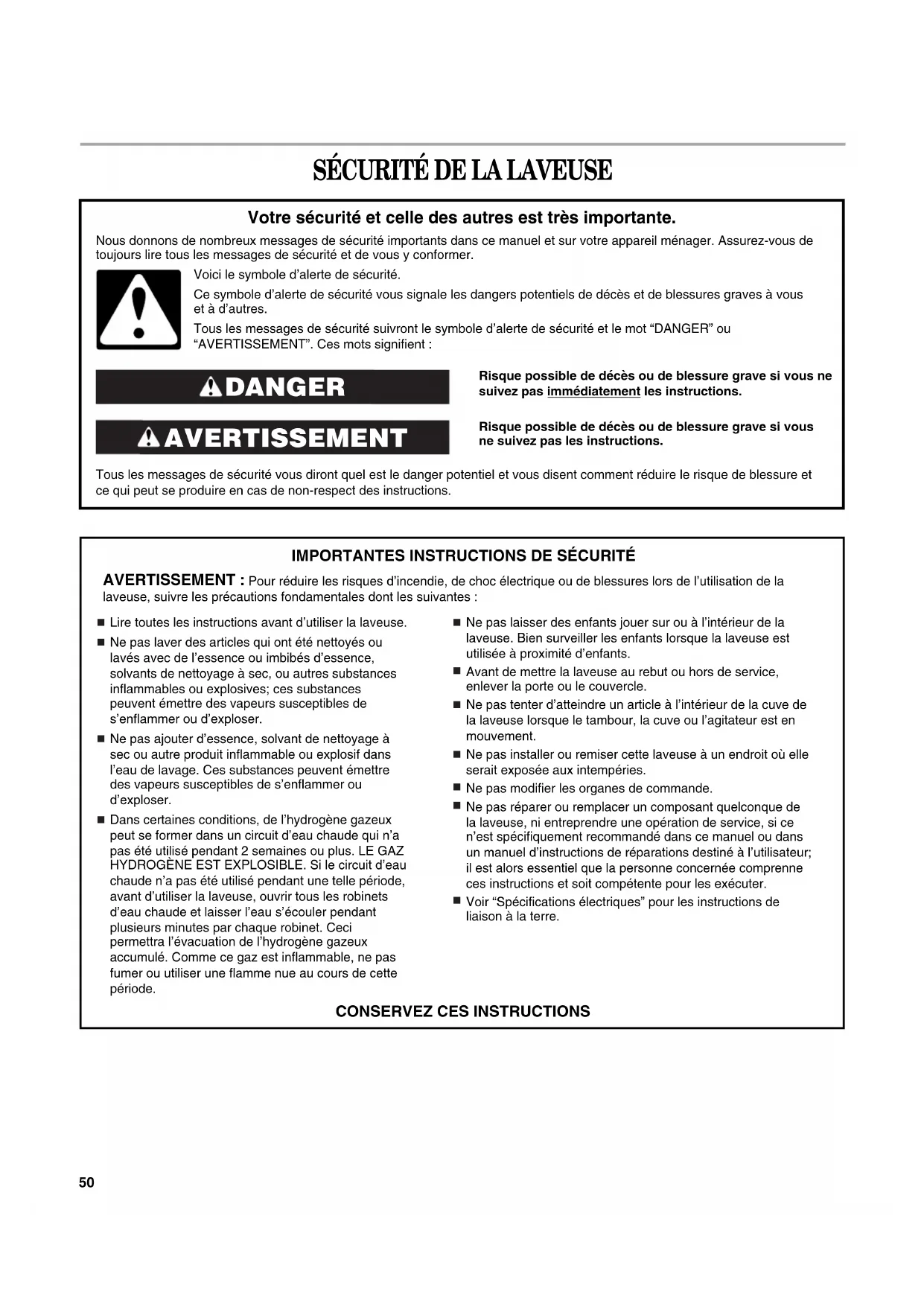 Lire toutes les instructions avant d’utiliser la laveuse. Ne pas laver des articles qui ont été nettoyés ou lavés avec de l’essence ou imbibés d’essence, solvants de nettoyage à sec, ou autres substances inflammables ou explosives; ces substances peuvent émettre des vapeurs susceptibles de s’enflammer ou d’exploser. Ne pas ajouter d’essence, solvant de nettoyage à sec ou autre produit inflammable ou explosif dans l’eau de lavage. Ces substances peuvent émettre des vapeurs susceptibles de s’enflammer ou d’exploser. Dans certaines conditions, de l’hydrogène gazeux peut se former dans un circuit d’eau chaude qui n’a pas été utilisé pendant 2 semaines ou plus. LE GAZ HYDROGÈNE EST EXPLOSIBLE. Si le circuit d’eau chaude n’a pas été utilisé pendant une telle période, avant d’utiliser la laveuse, ouvrir tous les robinets d’eau chaude et laisser l’eau s’écouler pendant plusieurs minutes par chaque robinet. Ceci permettra l’évacuation de l’hydrogène gazeux accumulé. Comme ce gaz est inflammable, ne pas fumer ou utiliser une flamme nue au cours de cette période. Ne pas laisser des enfants jouer sur ou à l’intérieur de la laveuse. Bien surveiller les enfants lorsque la laveuse est utilisée à proximité d’enfants. Avant de mettre la laveuse au rebut ou hors de service, enlever la porte ou le couvercle. Ne pas tenter d’atteindre un article à l’intérieur de la cuve de la laveuse lorsque le tambour, la cuve ou l’agitateur est en mouvement. Ne pas installer ou remiser cette laveuse à un endroit où elle serait exposée aux intempéries. Ne pas modifier les organes de commande. Ne pas réparer ou remplacer un composant quelconque de la laveuse, ni entreprendre une opération de service, si ce n’est spécifiquement recommandé dans ce manuel ou dans un manuel d’instructions de réparations destiné à l’utilisateur; il est alors essentiel que la personne concernée comprenne ces instructions et soit compétente pour les exécuter. Voir “Spécifications électriques” pour les instructions de liaison à la terre.