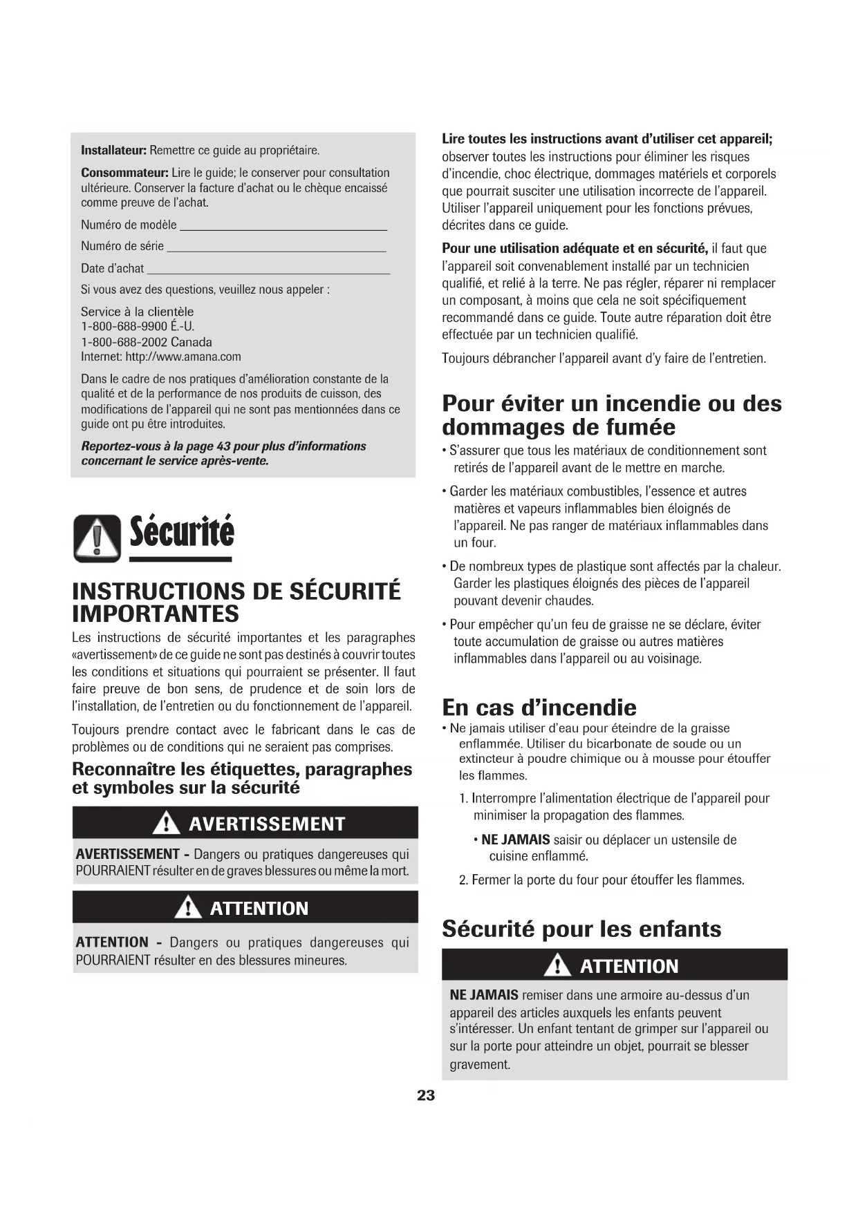 - Ne jamais utiliser d’eau pour éteindre de la graisseenflammée. Utiliser du bicarbonate de soude ou unextincteur à poudre chimique ou à mousse pour étoufferles flammes.1. Interrompre l’alimentation électrique de l’appareil pourminimiser la propagation des flammes.• NE JAMAIS saisir ou déplacer un ustensile decuisine enflammé.2. Fermer la porte du four pour étouffer les flammes. Sécurité pour les enfants NE JAMAIS remiser dans une armoire au-dessus d’unappareil des articles auxquels les enfants peuvents’intéresser. Un enfant tentant de grimper sur l’appareil ousur la porte pour atteindre un objet, pourrait se blessergravement.ATTENTION Sécurité 23• NE JAMAIS laisser des enfants seuls ou sans supervision lorsque l’appareil est en service ou encore chaud. Ne jamais laisser un enfant s’asseoir ou se tenir sur une partie quelconque de l’appareil. Il pourrait se blesser ou se brûler.