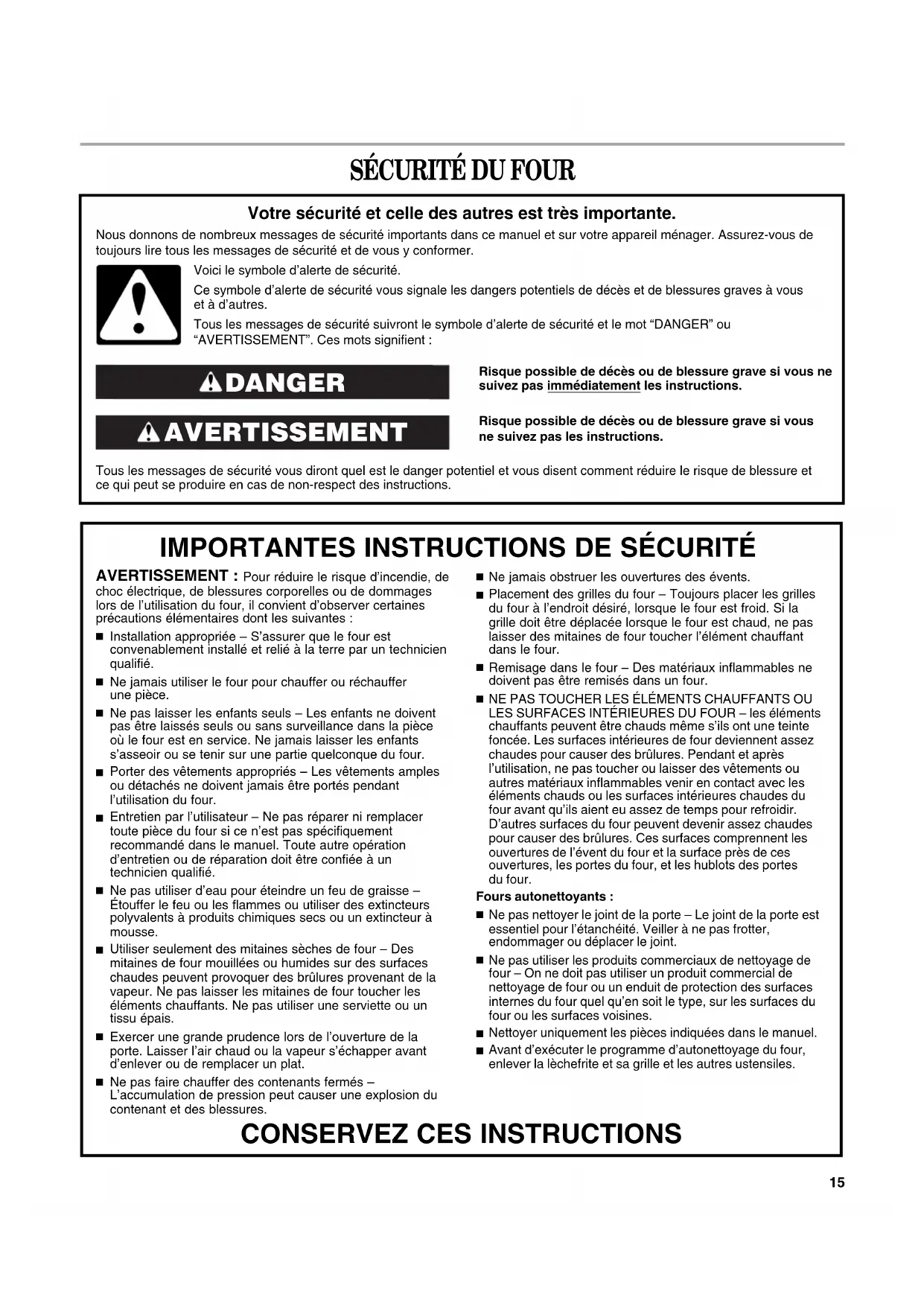 AVERTISSEMENT : Pour réduire le risque d’incendie, de choc électrique, de blessures corporelles ou de dommages lors de l’utilisation du four, il convient d’observer certaines précautions élémentaires dont les suivantes : Installation appropriée – S’assurer que le four est convenablement installé et relié à la terre par un technicien qualifié. Ne jamais utiliser le four pour chauffer ou réchauffer une pièce. Ne pas laisser les enfants seuls – Les enfants ne doivent pas être laissés seuls ou sans surveillance dans la pièce où le four est en service. Ne jamais laisser les enfants s’asseoir ou se tenir sur une partie quelconque du four. Porter des vêtements appropriés – Les vêtements amples ou détachés ne doivent jamais être portés pendant l’utilisation du four. Entretien par l’utilisateur – Ne pas réparer ni remplacer toute pièce du four si ce n’est pas spécifiquement recommandé dans le manuel. Toute autre opération d’entretien ou de réparation doit être confiée à un technicien qualifié. Ne pas utiliser d’eau pour éteindre un feu de graisse – Étouffer le feu ou les flammes ou utiliser des extincteurs polyvalents à produits chimiques secs ou un extincteur à mousse. Utiliser seulement des mitaines sèches de four – Des mitaines de four mouillées ou humides sur des surfaces chaudes peuvent provoquer des brûlures provenant de la vapeur. Ne pas laisser les mitaines de four toucher les éléments chauffants. Ne pas utiliser une serviette ou un tissu épais. Exercer une grande prudence lors de l’ouverture de la porte. Laisser l’air chaud ou la vapeur s’échapper avant d’enlever ou de remplacer un plat. Ne pas faire chauffer des contenants fermés – L’accumulation de pression peut causer une explosion du contenant et des blessures. Ne jamais obstruer les ouvertures des évents. Placement des grilles du four – Toujours placer les grilles du four à l’endroit désiré, lorsque le four est froid. Si la grille doit être déplacée lorsque le four est chaud, ne pas laisser des mitaines de four toucher l’élément chauffant dans le four. Remisage dans le four – Des matériaux inflammables ne doivent pas être remisés dans un four. NE PAS TOUCHER LES ÉLÉMENTS CHAUFFANTS OU LES SURFACES INTÉRIEURES DU FOUR – les éléments chauffants peuvent être chauds même s’ils ont une teinte foncée. Les surfaces intérieures de four deviennent assez chaudes pour causer des brûlures. Pendant et après l’utilisation, ne pas toucher ou laisser des vêtements ou autres matériaux inflammables venir en contact avec les éléments chauds ou les surfaces intérieures chaudes du four avant qu’ils aient eu assez de temps pour refroidir. D’autres surfaces du four peuvent devenir assez chaudes pour causer des brûlures. Ces surfaces comprennent les ouvertures de l’évent du four et la surface près de ces ouvertures, les portes du four, et les hublots des portes du four.Fours autonettoyants : Ne pas nettoyer le joint de la porte – Le joint de la porte est essentiel pour l’étanchéité. Veiller à ne pas frotter, endommager ou déplacer le joint. Ne pas utiliser les produits commerciaux de nettoyage de four – On ne doit pas utiliser un produit commercial de nettoyage de four ou un enduit de protection des surfaces internes du four quel qu’en soit le type, sur les surfaces du four ou les surfaces voisines. Nettoyer uniquement les pièces indiquées dans le manuel. Avant d’exécuter le programme d’autonettoyage du four, enlever la lèchefrite et sa grille et les autres ustensiles.16