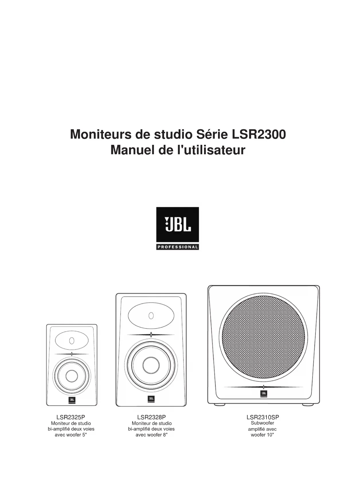 - N'exposezpasl'appareilàunruissellementouàdeséclaboussuresetneplacezpasd'objetcontenantun liquide,telqu'unvase,surl'appareil.Commepourtoutproduitélectronique,veillezànepasrenverserde liquideàl'intérieurdusystème.Lesliquidespeuvententraînerunepanneet/ouunrisqued'incendie. Surveillez ces symboles Le symbole en forme d'éclair à pointe de èche à l'intérieur d'un triangle équilatéral avertit l'utilisateur de la présence d'une « tension dangereuse » non isolée à l'intérieur du produit qui peut être sufsante pour constituer un risque d'électrocution des personnes. Le point d'exclamation à l'intérieur d'un triangle équilatéral avertit l'utilisateur de la présence d'instructions d'utilisation et de maintenance dans la documentation fournie avec le produit.4 Table des matières Consignes de sécurité importantes .............................................................................. 3 Introduction .................................................................................................................. 5 Mise en place du système ............................................................................................ 6 Sortir le produit de l'emballage ............................................................................... 6 Positionnement ...................................................................................................... 6 Connexions audio .................................................................................................. 7 Connexions au secteur .......................................................................................... 7 Produire un son ...................................................................................................... 7 Moniteurs de studio bi-ampliés LSR2328P et LSR2325P Vues avant et arrière .............................................................................................. 8 Panneau d'entrée ................................................................................................... 9 Connexions audio .................................................................................................. 9 Subwoofer de studio amplié LSR2310SP Vues avant et arrière ........................................................................................... 10 Panneau d'entrée ..................................................................................................11 Connexions audio .................................................................................................11 Réglage du niveau du subwoofer ........................................................................ 12 Positionnement et polarité ................................................................................... 12 Réglages du ltre actif et gestion du grave .......................................................... 12 Son surround et canal .1 LFE .............................................................................. 12 Connexions du système – Systèmes stéréo et surround ........................................... 13 Appendice A – Montage des LSR2328P et LSR2325P .............................................. 16 Appendice B – Dépannage ......................................................................................... 17 Spécications ............................................................................................................. 18 Informations de contact du SAV JBL .......................................................................... 20 Informations de garantie du produit ........................................................................... 215