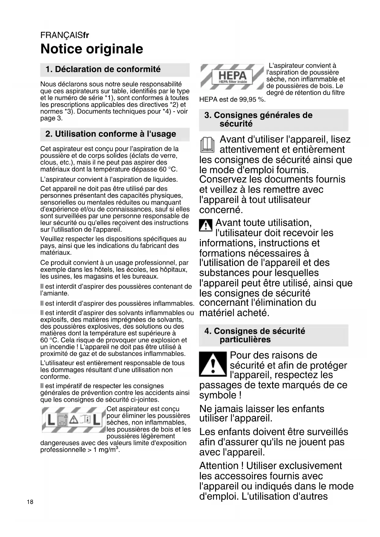 Notice originale Nous déclarons sous notre seule responsabilité que ces aspirateurs sur table, identifiés par le type et le numéro de série *1), sont conformes à toutes les prescriptions applicables des directives *2) et normes *3). Documents techniques pour *4) - voir page 3. Cet aspirateur est conçu pour l’aspiration de la poussière et de corps solides (éclats de verre, clous, etc.), mais il ne peut pas aspirer des matériaux dont la température dépasse 60 °C. L’aspirateur convient à l’aspiration de liquides. Cet appareil ne doit pas être utilisé par des personnes présentant des capacités physiques, sensorielles ou mentales réduites ou manquant d'expérience et/ou de connaissances, sauf si elles sont surveillées par une personne responsable de leur sécurité ou qu'elles reçoivent des instructions sur l'utilisation de l'appareil. Veuillez respecter les dispositions spécifiques au pays, ainsi que les indications du fabricant des matériaux. Ce produit convient à un usage professionnel, par exemple dans les hôtels, les écoles, les hôpitaux, les usines, les magasins et les bureaux. Il est interdit d’aspirer des poussières contenant de l’amiante. Il est interdit d’aspirer des poussières inflammables. Il est interdit d’aspirer des solvants inflammables ou explosifs, des matières imprégnées de solvants, des poussières explosives, des solutions ou des matières dont la température est supérieure à 60 °C. Cela risque de provoquer une explosion et un incendie ! L'appareil ne doit pas être utilisé à proximité de gaz et de substances inflammables. L'utilisateur est entièrement responsable de tous les dommages résultant d'une utilisation non conforme. Il est impératif de respecter les consignes générales de prévention contre les accidents ainsi que les consignes de sécurité ci-jointes. Cet aspirateur est conçu pour éliminer les poussières sèches, non inflammables, les poussières de bois et les poussières légèrement dangereuses avec des valeurs limite d'exposition professionnelle > 1 mg/m³. L'aspirateur convient à l'aspiration de poussière sèche, non inflammable et de poussières de bois. Le degré de rétention du filtre HEPA est de 99,95 %. Avant d'utiliser l'appareil, lisez attentivement et entièrement les consignes de sécurité ainsi que le mode d'emploi fournis. Conservez les documents fournis et veillez à les remettre avec l'appareil à tout utilisateur concerné. Avant toute utilisation, l'utilisateur doit recevoir les informations, instructions et formations nécessaires à l'utilisation de l'appareil et des substances pour lesquelles l'appareil peut être utilisé, ainsi que les consignes de sécurité concernant l'élimination du matériel acheté. Pour des raisons de sécurité et afin de protéger l'appareil, respectez les passages de texte marqués de ce symbole ! Ne jamais laisser les enfants utiliser l'appareil. Les enfants doivent être surveillés afin d'assurer qu'ils ne jouent pas avec l'appareil. Attention ! Utiliser exclusivement les accessoires fournis avec l'appareil ou indiqués dans le mode d'emploi. L'utilisation d'autres