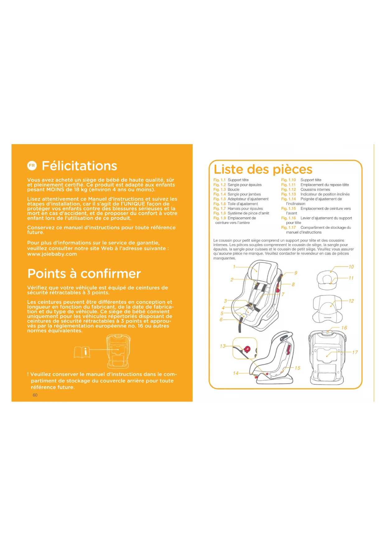 Félicitations Vous avez acheté un siège de bébé de haute qualité, sûr et pleinement certifié. Ce produit est adapté aux enfants pesant MOINS de 18 kg (environ 4 ans ou moins). Lisez attentivement ce Manuel d’instructions et suivez les étapes d’installation, car il s’agit de l’UNIQUE façon de protéger vos enfants contre des blessures sérieuses et la mort en cas d’accident, et de proposer du confort à votre enfant lors de l’utilisation de ce produit. Conservez ce manuel d’instructions pour toute référence future. Pour plus d’informations sur le service de garantie, veuillez consulter notre site Web à l’adresse suivante : www.joiebaby.com Points à confirmer Vérifiez que votre véhicule est équipé de ceintures de sécurité rétractables à 3 points. Les ceintures peuvent être différentes en conception et longueur en fonction du fabricant, de la date de fabrica- tion et du type de véhicule. Ce siège de bébé convient uniquement pour les véhicules répertoriés disposant de ceintures de sécurité rétractables à 3 points et approu- vés par la réglementation européenne no. 16 ou autres normes équivalentes. ! Veuillez conserver le manuel d’instructions dans le com- partiment de stockage du couvercle arrière pour toute référence future.