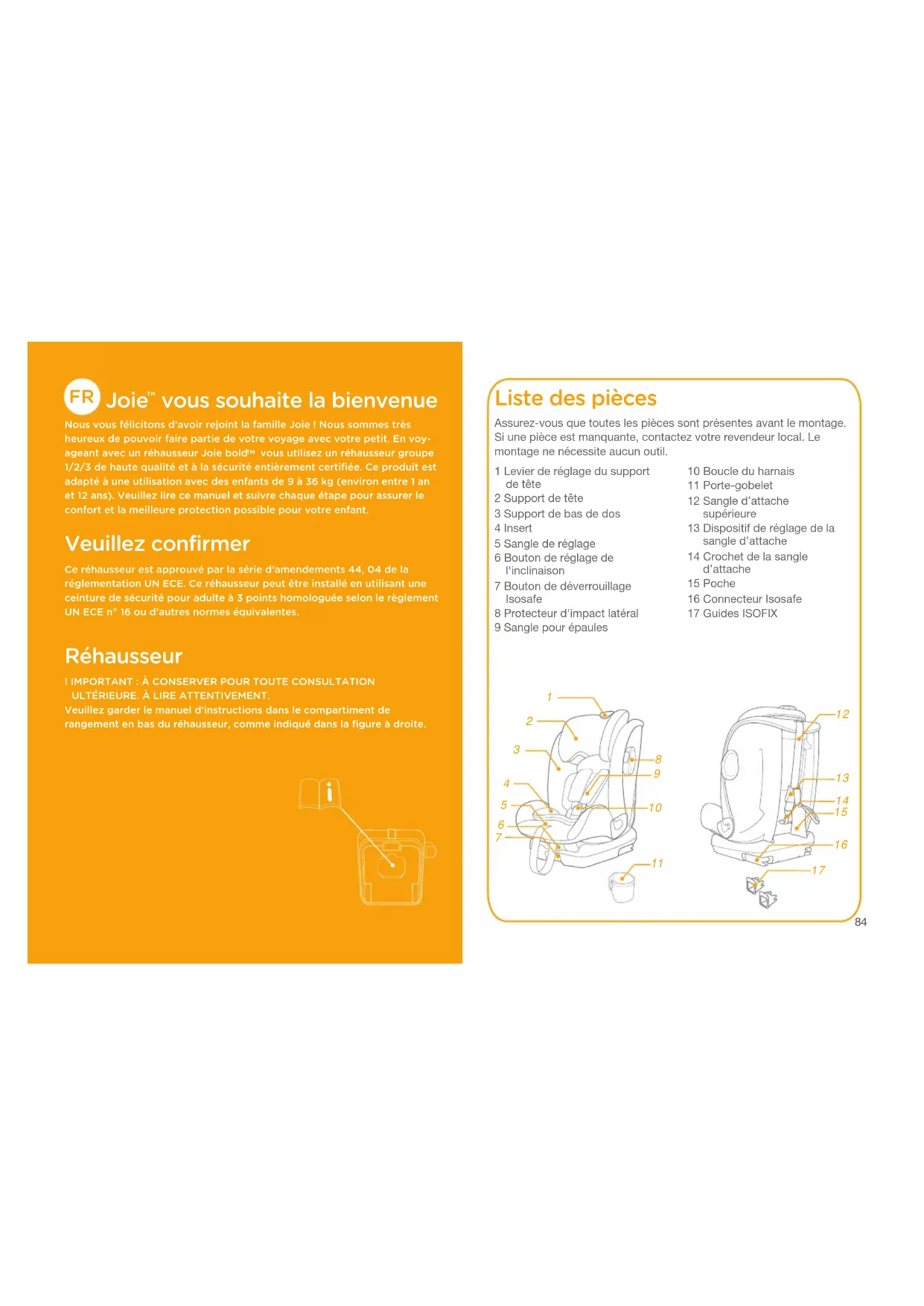 vous souhaite la bienvenue Nous vous félicitons d’avoir rejoint la famille Joie ! Nous sommes très heureux de pouvoir faire partie de votre voyage avec votre petit. En voy-ageant avec un réhausseur Joie bold vous utilisez un réhausseur groupe 1/2/3 de haute qualité et à la sécurité entièrement certifiée. Ce produit est adapté à une utilisation avec des enfants de 9 à 36 kg (environ entre 1 an et 12 ans). Veuillez lire ce manuel et suivre chaque étape pour assurer le confort et la meilleure protection possible pour votre enfant. Veuillez confirmer Ce réhausseur est approuvé par la série d’amendements 44, 04 de la réglementation UN ECE. Ce réhausseur peut être installé en utilisant une ceinture de sécurité pour adulte à 3 points homologuée selon le règlement UN ECE n° 16 ou d’autres normes équivalentes. Réhausseur ! IMPORTANT : À CONSERVER POUR TOUTE CONSULTATION ULTÉRIEURE. À LIRE ATTENTIVEMENT.Veuillez garder le manuel d’instructions dans le compartiment de rangement en bas du réhausseur, comme indiqué dans la figure à droite.