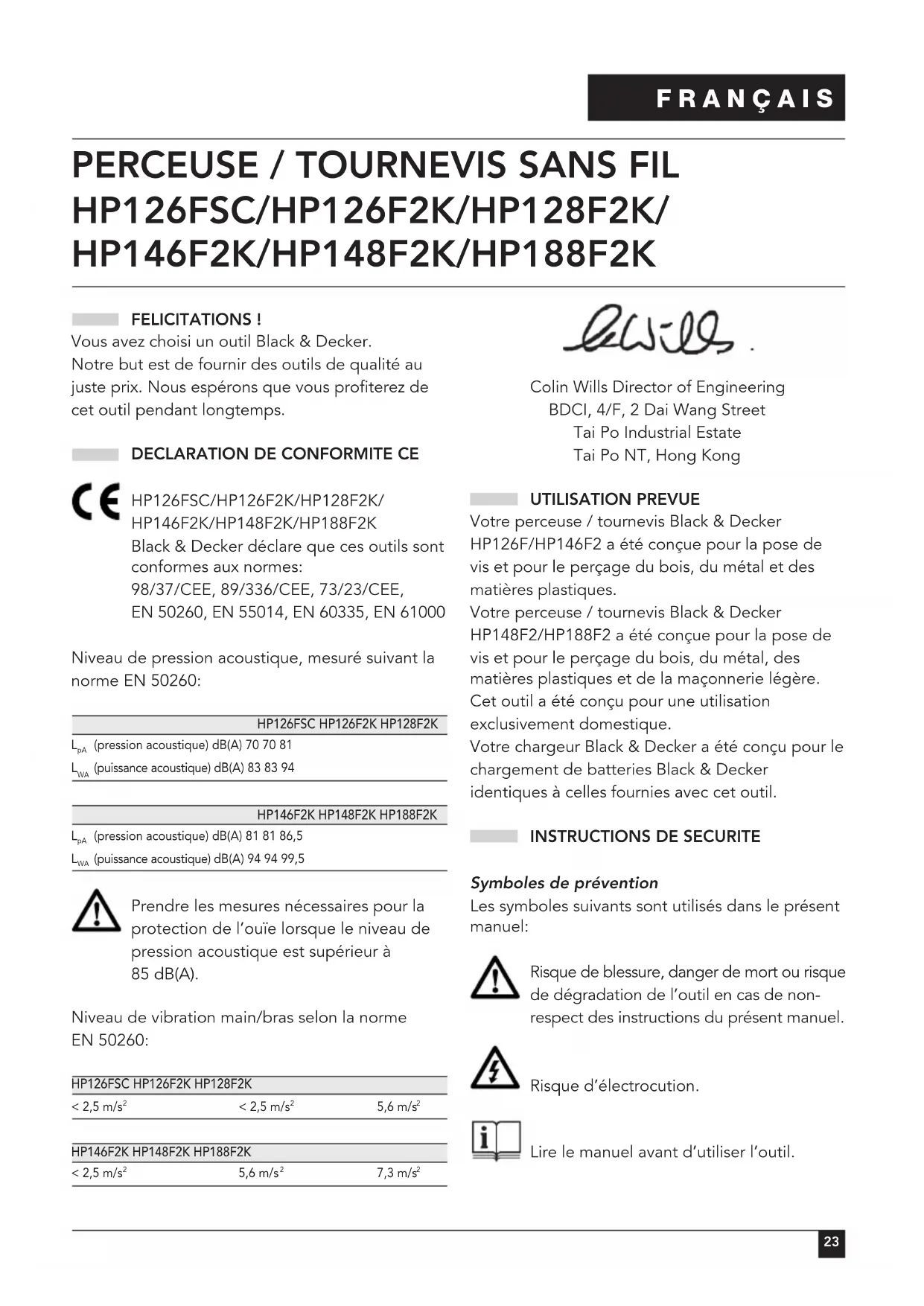 Colin Wills Director of Engineering BDCI, 4/F, 2 Dai Wang Street Tai Po Industrial Estate Tai Po NT, Hong Kong UTILISATION PREVUE Votre perceuse / tournevis Black & Decker HP126F/HP146F2 a été conçue pour la pose de vis et pour le perçage du bois, du métal et des matières plastiques. Votre perceuse / tournevis Black & Decker HP148F2/HP188F2 a été conçue pour la pose de vis et pour le perçage du bois, du métal, des matières plastiques et de la maçonnerie légère. Cet outil a été conçu pour une utilisation exclusivement domestique. Votre chargeur Black & Decker a été conçu pour le chargement de batteries Black & Decker identiques à celles fournies avec cet outil.