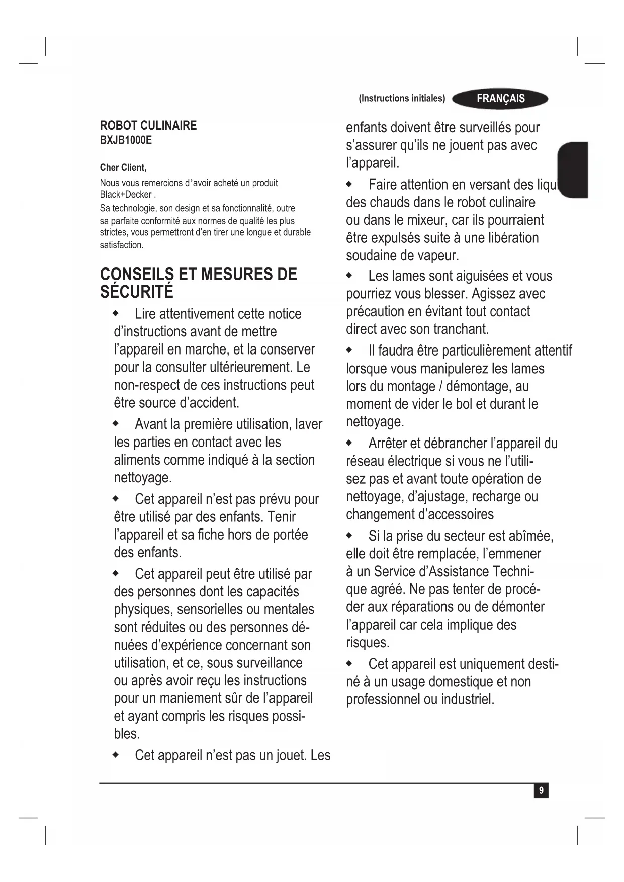 ROBOT CULINAIRE BXJB1000E Cher Client, Nous vous remercions d’avoir acheté un produit Black+Decker . Sa technologie, son design et sa fonctionnalité, outre sa parfaite conformité aux normes de qualité les plus strictes, vous permettront d’en tirer une longue et durable satisfaction.