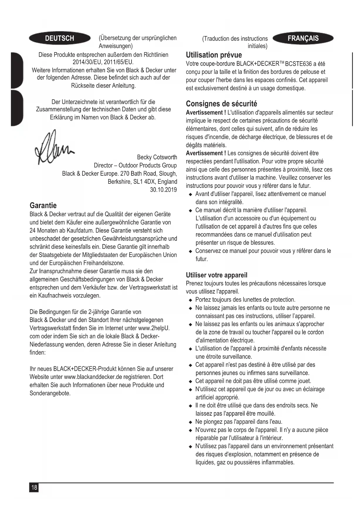 EXTÉRIEURES BCSTE636 - Coupe-bordure Black & Decker déclare que les produits décrits dans les "Caractéristiques techniques" sont conformes aux normes : 2006/42/CE, EN 60335-1:2012+A11+A13;25 (Traduction des instructions initiales) FRANÇAIS (Traduzione del testo originale) ITALIANO Uso previsto Il Tosaerba a lo BCSTE636 BLACK+ DECKER TM,