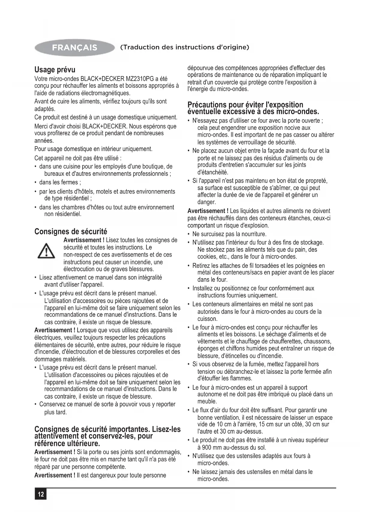 FRANÇAIS (Traduction des instructions d'origine) Usage prévu Votre micro-ondes BLACK+DECKER MZ2310PG a été conçu pour réchauffer les aliments et boissons appropriés à l'aide de radiations électromagnétiques. Avant de cuire les aliments, vérifiez toujours qu'ils sont adaptés. Ce produit est destiné à un usage domestique uniquement. Merci d'avoir choisi BLACK+DECKER. Nous espérons que vous profiterez de ce produit pendant de nombreuses années. Pour usage domestique en intérieur uniquement. Cet appareil ne doit pas être utilisé :