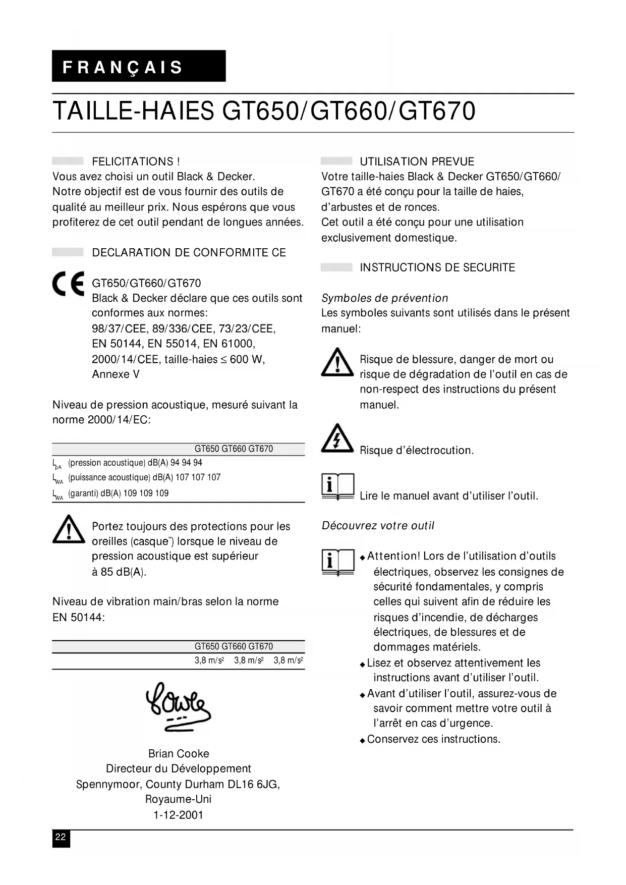 Brian Cooke Directeur du Développement Spennymoor, County Durham DL16 6JG, Royaume-Uni 1-12-2001 UTILISATION PREVUE Votre taille-haies Black & Decker GT650/GT660/ GT670 a été conçu pour la taille de haies, d’arbustes et de ronces. Cet outil a été conçu pour une utilisation exclusivement domestique.