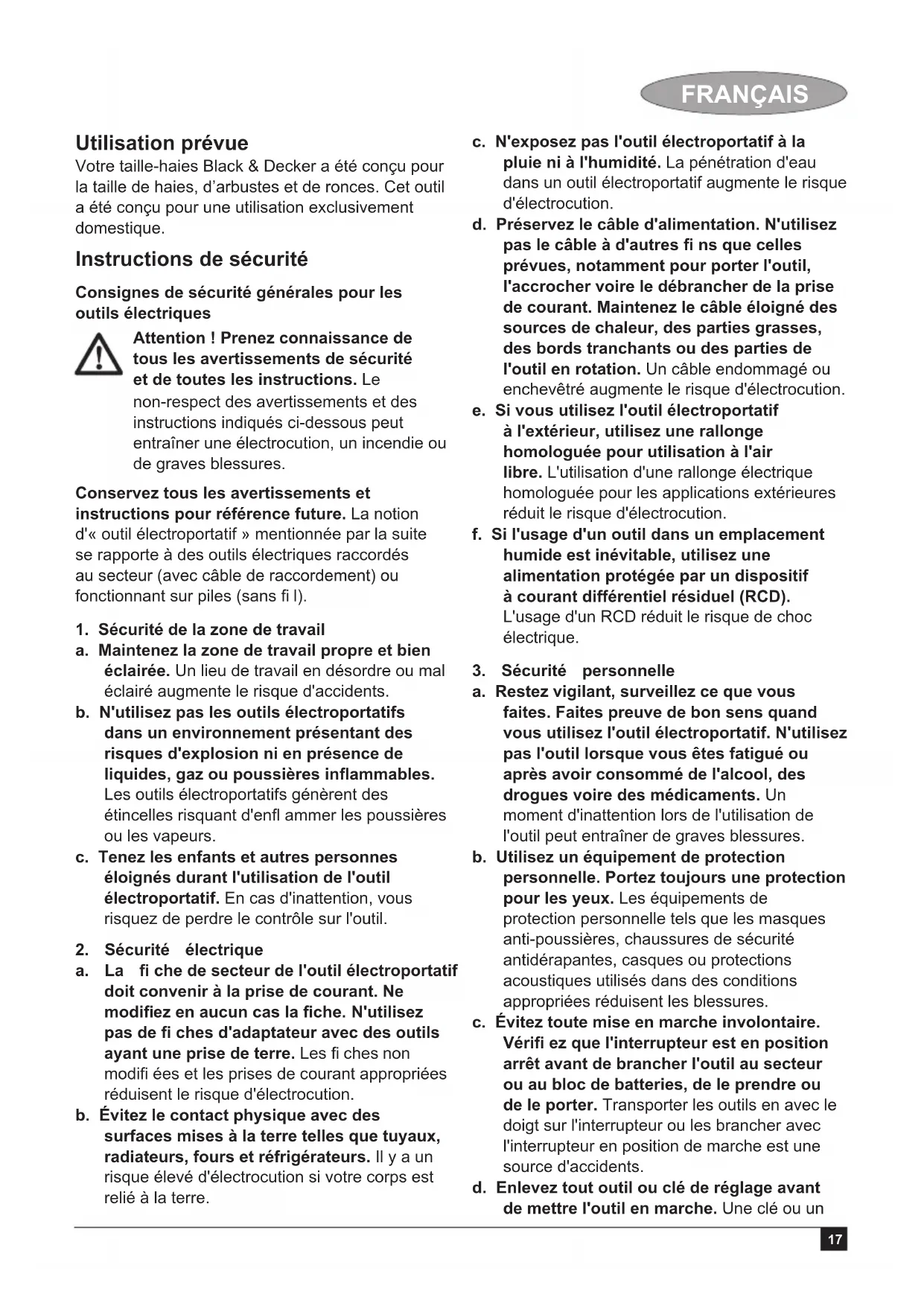 (pression sonore garantie) 99 dB(A) Ces produits sont également conformes à la directive 2004/108/CE. Pour en savoir plus, veuillez contacter Black & Decker à l'adresse suivante ou consultez le dos du manuel. Le soussigné est responsable de la compilation du fi chier technique et effectue cette déclaration au nom de Black & Decker. Kevin Hewitt Vice-président Ingénierie globale Black & Decker Europe, 210 Bath Road, Slough, Berkshire, SL1 3YD Royaume Uni 20-01-2010 Garantie Black & Decker est confi ant dans la qualité de ses produits et vous offre une garantie très étendue. Ce certifi cat de garantie est un document supplémentaire et ne peut en aucun cas se substituer à vos droits légaux. La garantie est valable sur tout le territoire des Etats Membres de l’Union Européenne et de la Zone de Libre Echange Européenne. Si un produit Black & Decker s’avère défectueux en raison de matériaux en mauvaises conditions, d’une erreur humaine, ou d’un manque de conformité dans les 24 mois suivant la date d’achat, Black & Decker garantit le remplacement des pièces défectueuses, la réparation des produits usés ou cassés ou remplace ces produits à la convenance du client, sauf dans les circonstances suivantes : ♦ Le produit a été utilisé dans un but commercial, professionnel, ou a été loué. ♦ Le produit a été mal utilisé ou avec négligence.23 FRANÇAIS ♦ Le produit a subi des dommages à cause d’objets étrangers, de substances ou à cause d’accidents. ♦ Des réparations ont été tentées par des techniciens ne faisant pas partie du service technique de Black & Decker. Pour avoir recours à la garantie, il est nécessaire de fournir une preuve d’achat au vendeur ou à un réparateur agréé. Pour connaître l’adresse du réparateur agréé le plus proche de chez vous, contactez le bureau Black & Decker à l’adresse indiquée dans ce manuel. Vous pourrez aussi trouver une liste des réparateurs agréés de Black & Decker et de plus amples détails sur notre service après-vente sur le site Internet à l’adresse suivante : www.2helpU.com Visitez notre site Web www.blackanddecker.fr pour enregistrer votre nouveau produit Black & Decker et être informé des nouveaux produits et des offres spéciales. Pour plus d’informations concernant la marque Black & Decker et notre gamme de produits, consultez notre site www.blackanddecker.fr24 ČEŠTINA Použití výrobku Vaše nůžky na živé ploty Black & Decker jsou určeny pro stříhání živých plotů, křovin a houštin. Tento výrobek je určen pouze pro spotřebitelské použití. Bezpečnostní pokyny Všeobecné bezpečnostní pokyny pro práci s elektrickým nářadím Varování! Pozorně si přečtěte všechna bezpečnostní varování a všechny pokyny. Nedodržení níže uvedených pokynů může mít za následek úraz elektrickým proudem, vznik požáru anebo vážné poranění. Veškerá bezpečnostní varování a pokyny uschovejte pro případné další použití. Označení elektrické nářadí ve všech níže uvedených upozorněních odkazuje na vaše nářadí napájené ze sítě (obsahuje napájecí kabel) nebo nářadí napájené bateriemi (bez napájecího kabelu).