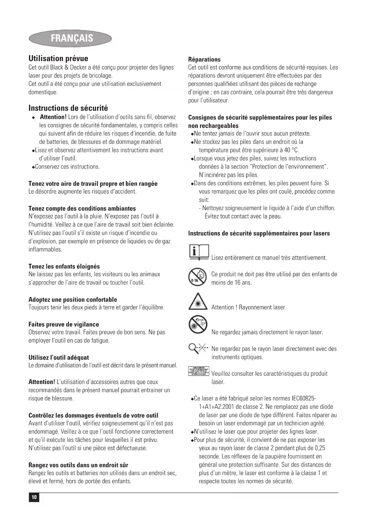 Montage Attention ! Assurez-vous que l’appareil est éteint. Mise en place des piles (fig. A) ◆ Retirez le couvercle des piles (4) de l’outil. ◆ Insérez les piles dans l’outil selon l’orientation illustrée. ◆ Remettez le couvercle en place jusqu’à ce qu’il s’enclenche. Montage mural (fig. B & C) L’outil peut être monté sur un mur en utilisant l’un des supports muraux (5 ou 6). La clavette murale (5) sert à suspendre l’outil à une cloison sèche. Le support en trou de serrure (6) permet d’accrocher l’outil sur d’autres types de murs à l’aide d’une vis ou d’un clou. Attention ! Veuillez ranger les supports muraux dans un endroit sûr lorsque vous ne vous en servez pas. Clavette murale ◆ Dépliez la languette pointue (7). ◆ Positionnez la clavette murale face à l’emplacement adéquat et enfoncez la clavette dans le mur. ◆ Installez l’outil en accrochant l’aimant (8) à la clavette murale (5). Attention ! Les clavettes murales sont pointues et doivent être manipulées avec précaution. Support en trou de serrure ◆ Enfoncez une vis ou un clou dans le mur. ◆ Suspendez le support mural (6) à la fixation. ◆ Installez l’outil en accrochant l’aimant (8) au support en trou de serrure (6). Utilisation (fig. D) ◆ Placez l’outil à plat contre le mur comme indiqué. ◆ Pour allumer l’outil, appuyez sur l’interrupteur marche/ arrêt (1). ◆ Déplacez l’outil pour mettre en place la ligne laser. ◆ Suspendez l’outil au mur avec le support mural approprié. Réglage de la ligne laser (fig. E) ◆ Afin de projeter une ligne verticale, réglez l’outil pour que la bulle (9) soit de niveau. ◆ Afin de projeter une ligne horizontale, réglez l’outil pour que la bulle (10) soit de niveau. Utilisation de la graduation La graduation (11) du support mural permet de procéder à des réglages angulaires. ◆ Alignez la position 0° de la graduation avec le pointeur de l’outil en faisant tourner la clavette murale. ◆ Pour vérifier un angle, réglez la graduation selon les besoins. Protection de l’environnement Collecte séparée. Ce produit ne doit pas être jeté avec les déchets domestiques normaux. Si vous décidez de remplacer ce produit Black & Decker, ou si vous n’en avez plus l’utilité, ne le jetez pas avec vos déchets domestiques Rendez-le disponible pour une collecte séparée. La collecte séparée des produits et emballages usés permet le recyclage des articles afin de les utiliser à nouveau. Le fait d’utiliser à nouveau des produits recyclés permet d’éviter la pollution environnementale et de réduire la demande de matières premières. Les réglementations locales peuvent permettre la collecte séparée des produits électriques du foyer, dans des déchetteries municipales ou auprès du revendeur vous ayant vendu votre nouveau produit. Black & Decker fournit un dispositif permettant de collecter et de recycler les produits Black & Decker lorsqu’ils ont atteint la fin de leur cycle de vie. Pour pouvoir profiter de ce service, veuillez retourner votre produit à un réparateur agréé qui se chargera de le collecter pour nous. Pour connaître l’adresse du réparateur agréé le plus proche de chez vous, contactez le bureau Black & Decker à l’adresse indiquée dans ce manuel. Vous pourrez aussi trouver une liste des réparateurs agréés de Black & Decker et de plus amples détails sur notre service après-vente sur le site Internet à l’adresse suivante : www.2helpU.com12 FRANÇAIS Piles A la fin de leur durée de vie technique, jetez les piles en respectant l’environnement : ◆ Retirez les piles comme décrit ci-dessus. ◆ Placez les piles dans un emballage adapté pour éviter toute possibilité d’un court-circuit entre les bornes. ◆ Amenez les piles à une station de recyclage locale. Caractéristiques techniques BDL120 Tension V 3 Taille des piles 2 x LR6 (AA) Classe de laser 2 Température de travail °C 0 - 40 Poids (sans batterie) kg 0,2 Déclaration de conformité CE Black & Decker déclare que ces outils sont conformes aux normes: EN 61010-1, IEC 60825-1, EN 61000-6-3, EN 61000-6-1 Kevin Hewitt Directeur du Développement Spennymoor, County Durham DL16 6JG, Royaume-Uni 1-10-2005 Garantie Black & Decker est confiant dans la qualité de ses produits et vous offre une garantie très étendue. Ce certificat de garantie est un document supplémentaire et ne peut en aucun cas se substituer à vos droits légaux. La garantie est valable sur tout le territoire des Etats Membres de l’Union Européenne et de la Zone de Libre Echange Européenne. Si un produit Black & Decker s’avère défectueux en raison de matériaux en mauvaises conditions, d’une erreur humaine, ou d’un manque de conformité dans les 24 mois suivant la date d’achat, Black & Decker garantit le remplacement des pièces défectueuses, la réparation des produits usés ou cassés ou remplace ces produits à la convenance du client, sauf dans les circonstances suivantes : ◆ Le produit a été utilisé dans un but commercial, professionnel, ou a été loué. ◆ Le produit a été mal utilisé ou avec négligence. ◆ Le produit a subi des dommages à cause d’objets étrangers, de substances ou à cause d’accidents. ◆ Des réparations ont été tentées par des techniciens ne faisant pas partie du service technique de Black & Decker. Pour avoir recours à la garantie, il est nécessaire de fournir une preuve d’achat au vendeur ou à un réparateur agréé. Pour connaître l’adresse du réparateur agréé le plus proche de chez vous, contactez le bureau Black & Decker à l’adresse indiquée dans ce manuel. Vous pourrez aussi trouver une liste des réparateurs agréés de Black & Decker et de plus amples détails sur notre service après-vente sur le site Internet à l’adresse suivante : www.2helpU.com Visitez notre site Web www.blackanddecker.fr pour enregistrer votre nouveau produit Black
