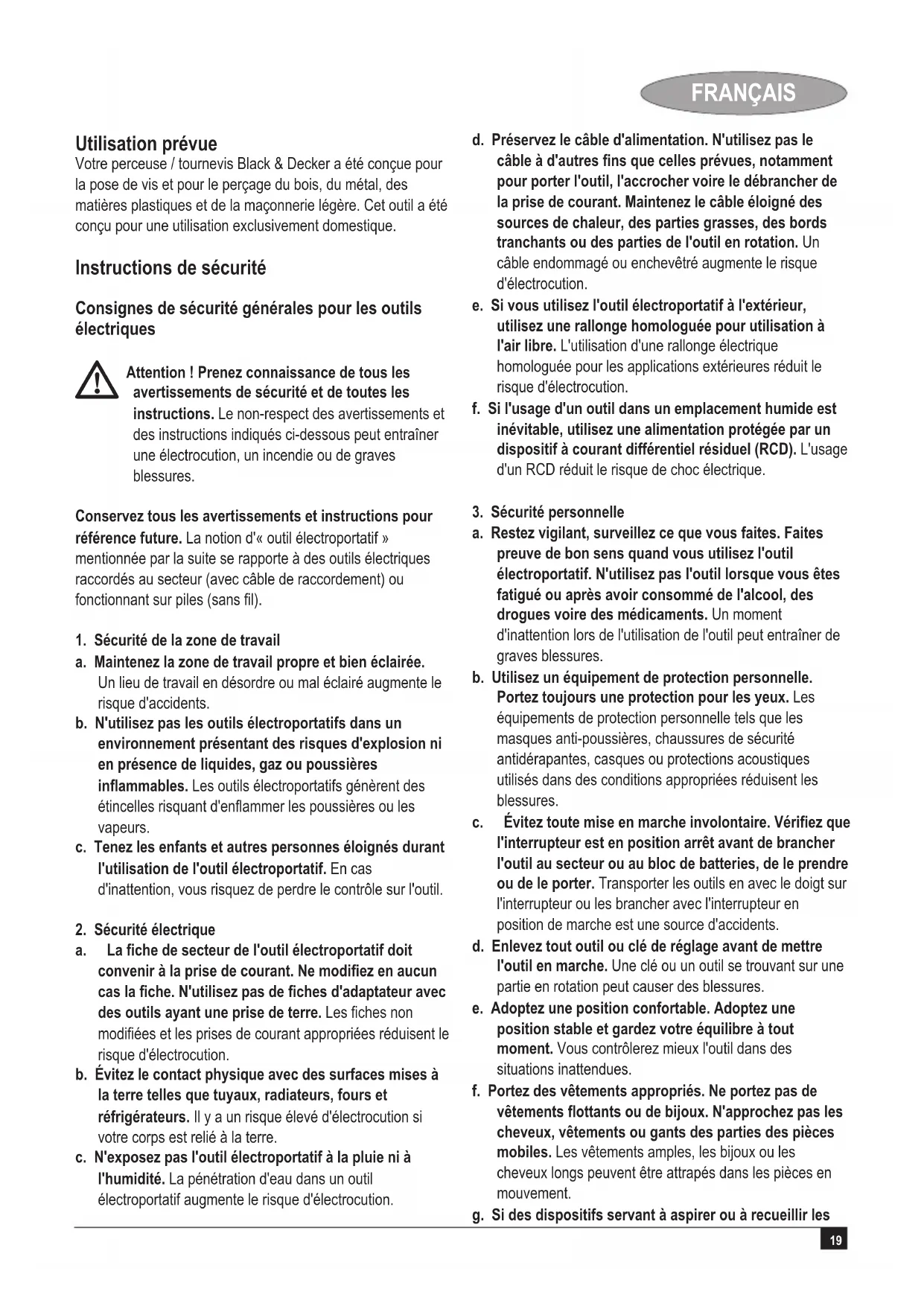 Kevin Hewitt Vice-président Ingénierie globale Black & Decker Europe, 210 Bath Road, Slough, Berkshire, SL1 3YD Royaume Uni 09/02/2010 Garantie Black & Decker est conant dans la qualité de ses produits et vous offre une garantie très étendue. Ce certicat de garantie est un document supplémentaire et ne peut en aucun cas se substituer à vos droits légaux. La garantie est valable sur tout le territoire des Etats Membres de l'Union Européenne et de la Zone de Libre Echange Européenne. Si un produit Black & Decker s'avère défectueux en raison de matériaux en mauvaises conditions, d'une erreur humaine, ou d'un manque de conformité dans les 24 mois suivant la date d'achat, Black & Decker garantit le remplacement des pièces défectueuses, la réparation des produits usés ou cassés ou remplace ces produits à la convenance du client, sauf dans les circonstances suivantes : u Le produit a été utilisé dans un but commercial, professionnel, ou a été loué. u Le produit a été mal utilisé ou avec négligence.u Le produit a subi des dommages à cause d'objets étrangers, de substances ou à cause d'accidents. u Des réparations ont été tentées par des techniciens ne faisant pas partie du service technique de Black & Decker. Pour avoir recours à la garantie, il est nécessaire de fournir une preuve d'achat au vendeur ou à un réparateur agréé. Pour connaître l'adresse du réparateur agréé le plus proche de chez vous, contactez le bureau Black & Decker à l'adresse indiquée dans ce manuel. Vous pourrez aussi trouver une liste des réparateurs agréés de Black & Decker et de plus amples détails sur notre service après-vente sur le site Internet à l'adresse suivante : www.2helpU.com Visitez notre site Web www.blackanddecker.fr pour enregistrer votre nouveau produit Black & Decker et être informé des nouveaux produits et des offres spéciales. Pour plus d'informations concernant la marque Black & Decker et notre gamme de produits, consultez notre site www.blackanddecker.fr26 ITALIANO Uso previsto Il trapano / cacciavite Black & Decker è stato progettato per inserire ed estrarre viti e trapanare legno, metalli, plastica e muratura. L'utensile é stato progettato per un uso individuale. Precauzioni di sicurezza Avvisi generali di sicurezza per l'elettroutensile