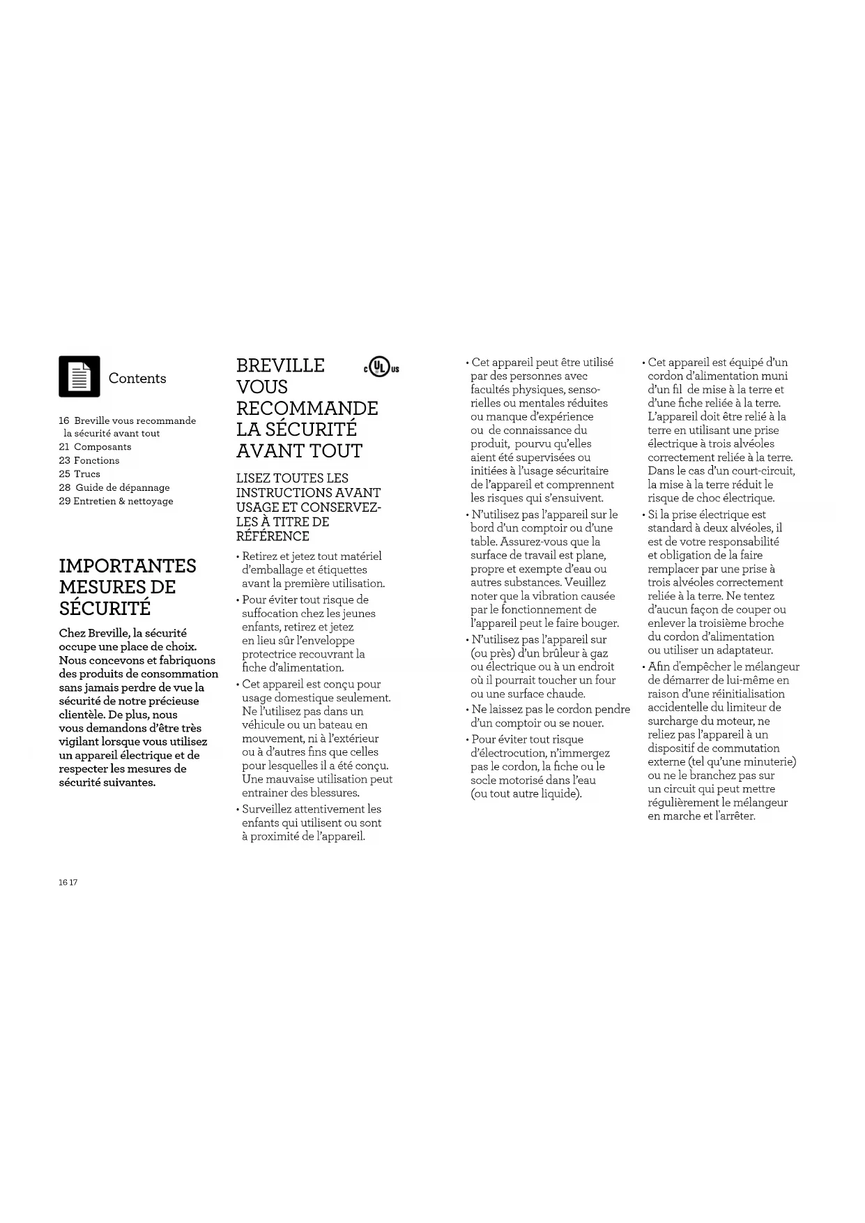 - Surveillez attentivement les enfants qui utilisent ou sont à proximité de l’appareil. 16 Breville vous recommande la sécurité avant tout 21 Composants 23 Fonctions 25 Trucs 28 Guide de dépannage 29 Entretien & nettoyage Contents