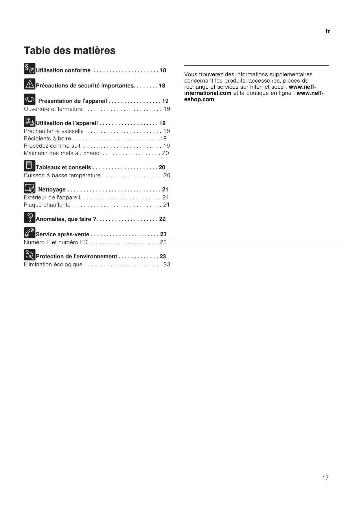 - Présentation de l'appareil . . . . . . . . . . . . . . . . . 19 Ouverture et fermeture . . . . . . . . . . . . . . . . . . . . . . . . 19 1 Utilisation de l’appareil . . . . . . . . . . . . . . . . . . . 19 Préchauffer la vaisselle . . . . . . . . . . . . . . . . . . . . . . . 19 Récipients à boire . . . . . . . . . . . . . . . . . . . . . . . . . . .19 Procédez comme suit . . . . . . . . . . . . . . . . . . . . . . . . 19 Maintenir des mets au chaud. . . . . . . . . . . . . . . . . . . 20 J Tableaux et conseils . . . . . . . . . . . . . . . . . . . . . 20 Cuisson à basse température . . . . . . . . . . . . . . . . . . 20 D Nettoyage . . . . . . . . . . . . . . . . . . . . . . . . . . . . . . 21 Extérieur de l'appareil. . . . . . . . . . . . . . . . . . . . . . . . . 21 Plaque chauffante . . . . . . . . . . . . . . . . . . . . . . . . . . . 21 3 Anomalies, que faire ?. . . . . . . . . . . . . . . . . . . . 22 4 Service après-vente . . . . . . . . . . . . . . . . . . . . . . 23 Numéro E et numéro FD . . . . . . . . . . . . . . . . . . . . . .23 7 Protection de l'environnement . . . . . . . . . . . . . 23 Elimination écologique . . . . . . . . . . . . . . . . . . . . . . . . 23 Produktinfo Vous trouverez des informations supplementaires concernant les produits, accessoires, pièces de rechange et services sur Internet sous : www.neff- international.com et la boutique en ligne : www.neff- eshop.comfr Utilisation conforme