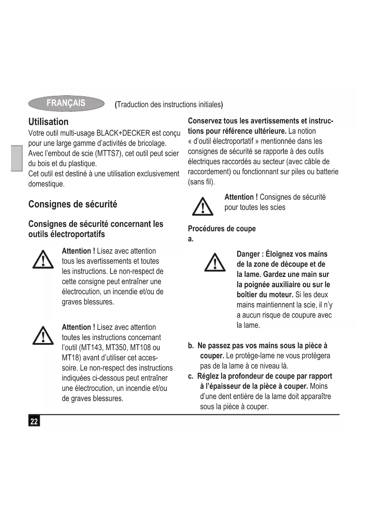 Assemblage Attention ! Avant l’assemblage, retirez la batterie de l’outil. Installation et retrait d’une lame (gures A et B) u Pour verrouiller l’outil, placez le bouton de commande avant/arrière (2) au centre. u Maintenez le bouton de verrouillage de l’axe (12) enfoncé. Avec la clé hexagonale (17) fournie, retirez le boulon de la lame (18) en le tournant dans le sens des aiguilles d’une montre. u Retirez la rondelle de serrage extérieure (19). Assurez-vous que la rondelle de serrage intérieure (20) reste sur l’axe (21). u Rétractez le protège-lame inférieur (15) à l’aide du levier de rétractation du protège-lame (16) et placez la lame de scie (22) sur la rondelle de serrage intérieure (20), en s’assurant que la èche sur les points de la lame sont dans la direction de la èche sur le protège-lame inférieur. u Placez la rondelle de serrage extérieure (19) sur l’axe (21). u Installez le boulon de lame (18) dans l’axe (21) en le tournant dans le sens contraire des aiguilles d’une montre. u Maintenez le bouton de verrouillage de l’axe (12) enfoncé. Avec la clé hexagonale (17) fournie, serrez le boulon de la lame (18) en le tournant dans le sens contraire des aiguilles d’une montre. Attention ! N’enclenchez jamais le verrou de l’axe quand la scie fonctionne, ceci aurait pour effet de forcer l’arrêt de l’outil. Ne mettez jamais l’outil en marche quand le verrou de l’axe est enclenché. Votre scie pourrait être sérieusement endom- magée. Attention ! Avant l’utilisation, vériez toujours l’installation de la lame. Avec la clé hexagonale (17) fournie, tournez l’axe dans le sens contraire des aiguilles d’une montre et assurez-vous que la lame ne touche pas le protège-lame avant de mettre l’outil en marche.28 (Traduction des instructions initiales) FRANÇAIS Utilisation Attention ! Laissez l’outil fonctionner à sa propre vitesse. Ne le poussez pas au-delà de sa limite. Scier Remarque : Assurez-vous que le bouton de com- mande avant/arrière (2) est dans la position avant. u Pour mettre l’outil en marche, levez le bouton de déblocage (11), puis appuyez sur le sélect- eur de vitesse (1). La vitesse de l’outil dépend de la pression sur le bouton. u Relâchez le bouton de déblocage. u Pour arrêter l’outil, relâchez le sélecteur de vitesse. Remarque : Prenez les précautions nécessaires pour que les bouts de lame ne chauffent pas. Attention ! En coupant du plastic, il est important de ne pas laisser les extrémités chauffer. Si elles sont chaudes, les extrémités peuvent faire fondre le plastic. Évacuation de poussière La sortie de refoulement de poussière est utilisée pour connecter l’aspirateur ou le récupérateur de poussière à l’outil. L’évacuation de poussière doit être utilisée pour couper le bois u Raccordez le tuyau d’aspirateur en le glissant dans la sortie de refoulement de poussière. Conseils pour une utilisation optimale Scier u Utilisez toujours le type approprié de lame cor- respondant au matériau de la pièce à couper. u Tenez toujours l’outil avec les deux mains. u Laissez la lame fonctionner librement pendant quelques secondes avant de commencer la découpe. u N’appliquez qu’une légère pression sur l’outil pendant la découpe. u Travaillez avec la semelle contre la pièce. u Étant donné que les éclats de bois le long de la ligne de coupe sont inévitables, coupez sur le côté où les éclats sont acceptables. u Pour limiter les éclats de bois, par exemple en coupant de l’aggloméré, serrez un morceau de contreplaqué sur le dessus de la pièce à couper. u Soutenez les grands panneaux pour limiter les pincements et les effets de retour de la lame. Les grands panneaux ont tendance à échir à cause de leur propre poids. u Il faut les maintenir en dessous et des deux côtés, près de la ligne de coupe et près du bord du panneau à couper. u Ne tenez jamais la pièce à couper dans vos mains ou entre vos jambes.29 (Traduction des instructions initiales) FRANÇAIS u Fixez la pièce à couper sur un endroit stable à l’aide de pinces. La pièce à couper doit être correctement soutenue pour éviter de coincer la lame, de perdre le contrôle et pour limiter les risques de blessures. Accessoires La qualité du travail réalisé par votre outil dépend des accessoires utilisés. Les accessoires BLACK +DECKER et Piranha correspondent aux normes de qualité supérieure et sont conçus pour donner le meilleur résultat possible. En utilisant ces accessoires, votre outil vous donnera entière satisfaction. Caractéristiques techniques MTTS7 (14.4V) (H1) MTTS7 (Max) (H1) Vitesse à vide min