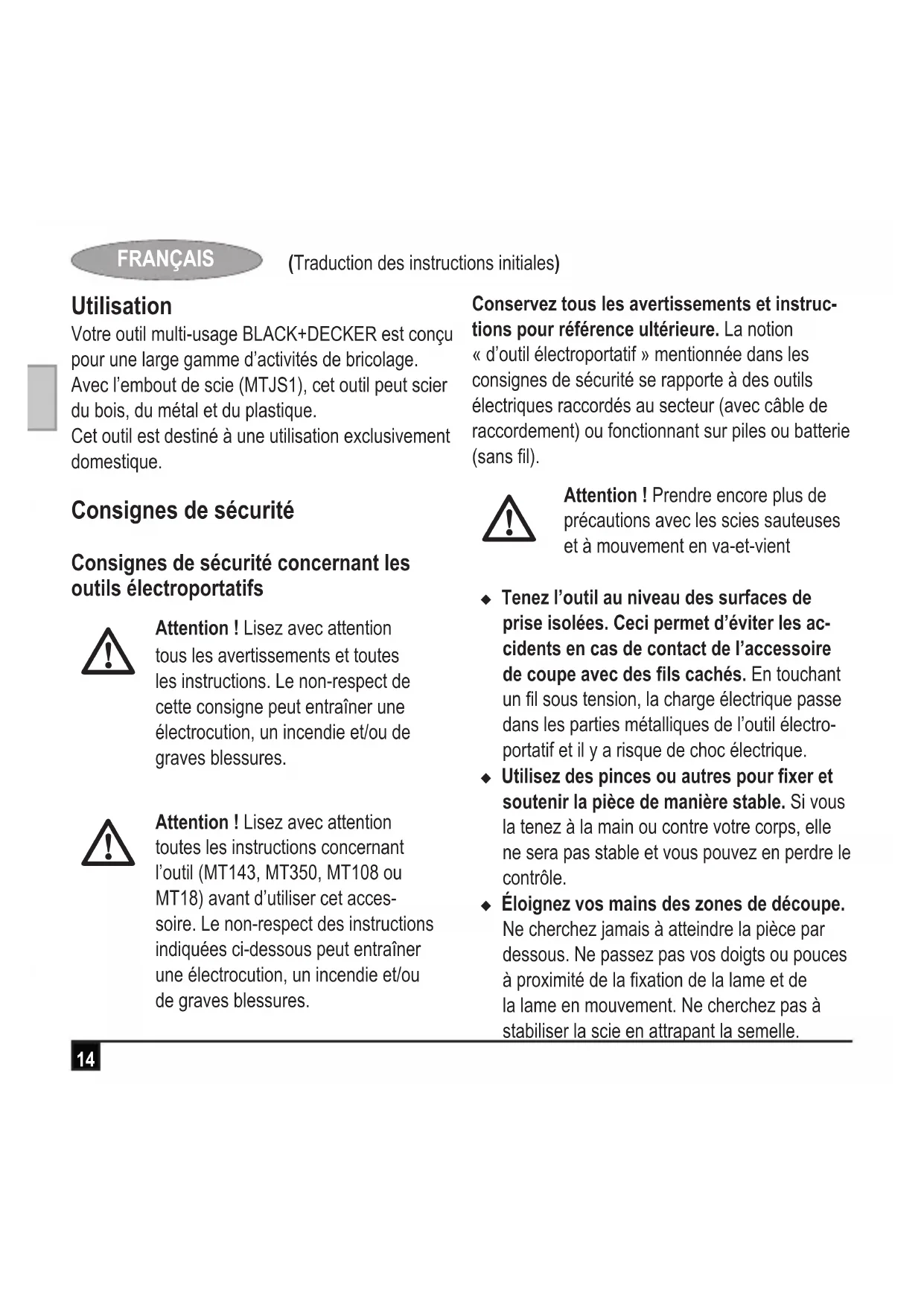 MTJS1 Black & Decker conrme que les produits décrits dans les « Données techniques » sont conformes aux normes : 2006/42/CE, EN60745-1, EN60745-2-1, EN60745-2-11 Ces produits sont également conformes aux Direc- tives 2014/30/UE et 2011/65/UE. Pour plus de dé- tails, veuillez contacter Black & Decker à l’adresse suivante ou reportez-vous au dos du manuel. Le soussigné est responsable des données de la che technique et fait cette déclaration au nom de Black & Decker. R. Laverick Responsable technique Black & Decker Europe, 210 Bath Road, Slough, Berkshire, SL1 3YD Royaume-Uni 08/09/201420 (Traduzione del testo originale) ITALIANO Uso previsto L’elettroutensile multiuso BLACK+DECKER è stato ideato per un’ampia gamma di applicazioni Fai da te. Con la testa a sega (MTJS1), è ideale per segare legno, metallo e plastica. L’elettroutensile è stato progettato solo per uso privato. Istruzioni di sicurezza Avvisi di sicurezza generici per gli elet- troutensili