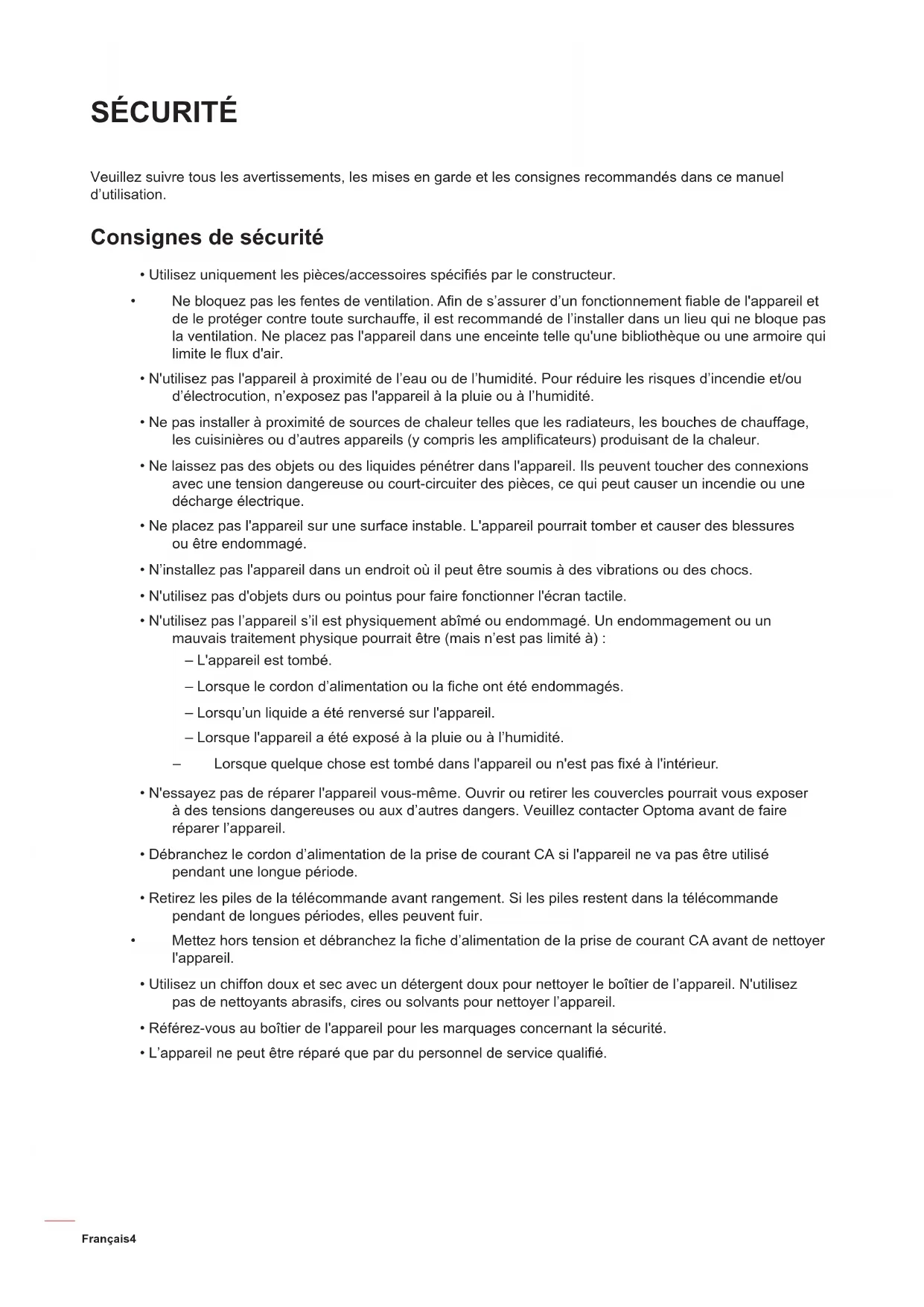 - N'essayez pas de réparer l'appareil vous-même. Ouvrir ou retirer les couvercles pourrait vous exposer à des tensions dangereuses ou aux d’autres dangers. Veuillez contacter Optoma avant de faire réparer l’appareil.