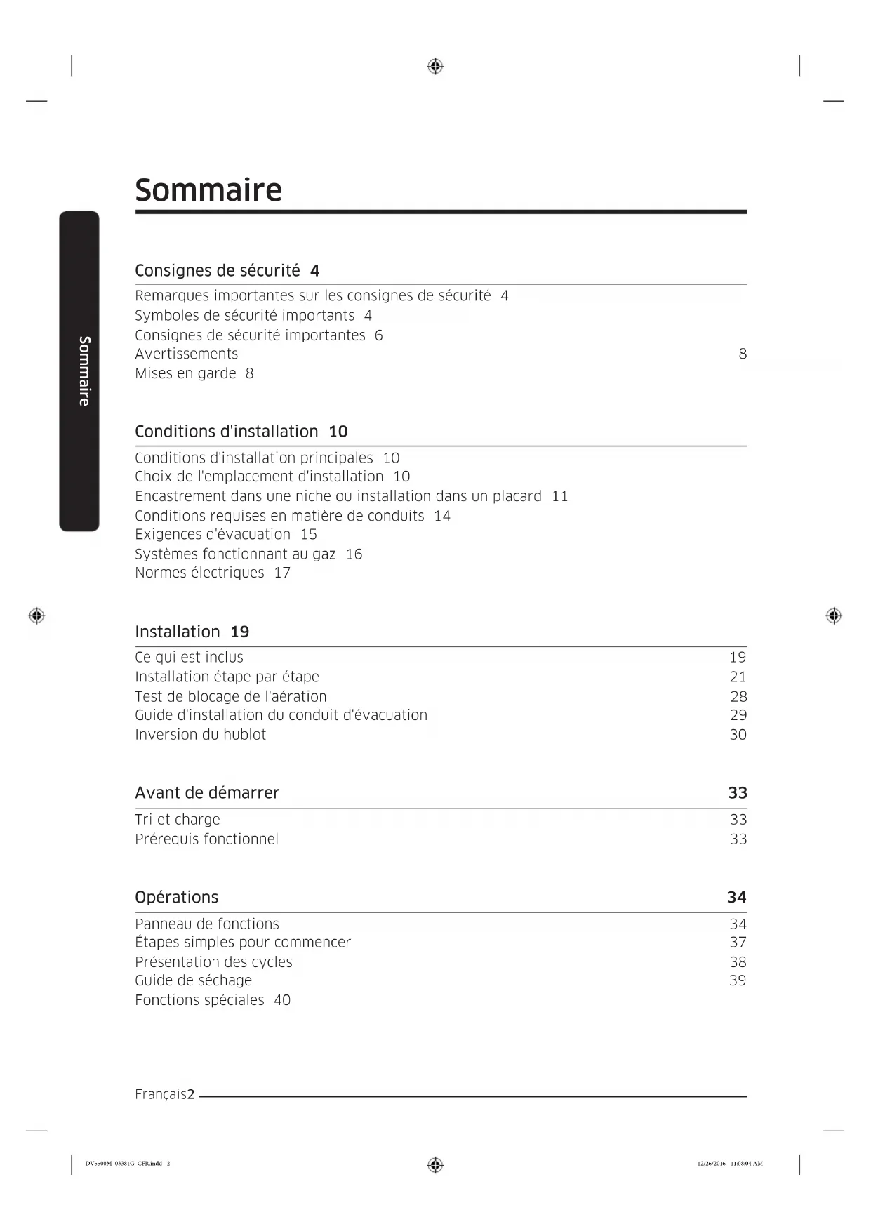 DV5500M_03381G_CFR.indd 1 12/26/2016 11:08:04 AMSommaire Français2 Sommaire Consignes de sécurité 4 Remarques importantes sur les consignes de sécurité 4 Symboles de sécurité importants 4 Consignes de sécurité importantes 6 Avertissements 8 Mises en garde 8 Conditions d'installation 10 Conditions d'installation principales 10 Choix de l'emplacement d'installation 10 Encastrement dans une niche ou installation dans un placard 11 Conditions requises en matière de conduits 14 Exigences d'évacuation 15 Systèmes fonctionnant au gaz 16 Normes électriques 17 Installation 19 Ce qui est inclus 19 Installation étape par étape 21 Test de blocage de l'aération 28 Guide d'installation du conduit d'évacuation 29 Inversion du hublot 30 Avant de démarrer 33 Tri et charge 33 Prérequis fonctionnel 33 Opérations 34 Panneau de fonctions 34 Étapes simples pour commencer 37 Présentation des cycles 38 Guide de séchage 39 Fonctions spéciales 40 DV5500M_03381G_CFR.indd 2 12/26/2016 11:08:04 AMSommaire Français 3 Maintenance 42 Capteur de ventilation 42 Nettoyage 43 Dépannage 44 Contrôles à effectuer 44 Codes d'information 47 Caractéristiques techniques 48 Tableau des symboles textiles 48 Protection de l'environnement 49 Fiche de caractéristiques techniques 50 Tableau des cycles 51 DV5500M_03381G_CFR.indd 3 12/26/2016 11:08:04 AMConsignes de sécurité