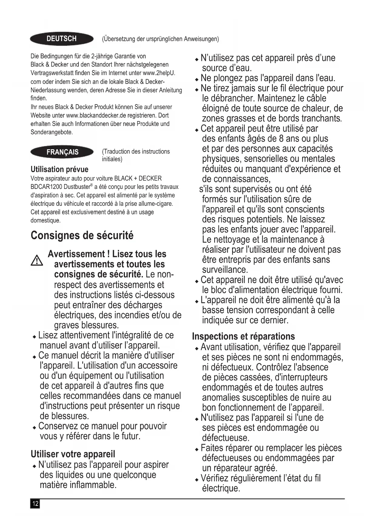 Avertissement ! Lisez tous les avertissements et toutes les consignes de sécurité. Le non- respect des avertissements et des instructions listés ci-dessous peut entraîner des décharges électriques, des incendies et/ou de graves blessures. u Lisez attentivement l'intégralité de ce manuel avant d’utiliser l’appareil. u Ce manuel décrit la manière d'utiliser l'appareil. L'utilisation d'un accessoire ou d'un équipement ou l'utilisation de cet appareil à d'autres ns que celles recommandées dans ce manuel d'instructions peut présenter un risque de blessures. u Conservez ce manuel pour pouvoir vous y référer dans le futur. Utiliser votre appareil u N’utilisez pas l'appareil pour aspirer des liquides ou une quelconque matière inammable. u N’utilisez pas cet appareil près d’une source d’eau. u Ne plongez pas l'appareil dans l'eau.u Ne tirez jamais sur le l électrique pour le débrancher. Maintenez le câble éloigné de toute source de chaleur, de zones grasses et de bords tranchants. u Cet appareil peut être utilisé par des enfants âgés de 8 ans ou plus et par des personnes aux capacités physiques, sensorielles ou mentales réduites ou manquant d'expérience et de connaissances, s'ils sont supervisés ou ont été formés sur l'utilisation sûre de l'appareil et qu'ils sont conscients des risques potentiels. Ne laissez pas les enfants jouer avec l'appareil. Le nettoyage et la maintenance à réaliser par l'utilisateur ne doivent pas être entrepris par des enfants sans surveillance. u Cet appareil ne doit être utilisé qu'avec le bloc d'alimentation électrique fourni. u L'appareil ne doit être alimenté qu'à la basse tension correspondant à celle indiquée sur ce dernier. Inspections et réparations u Avant utilisation, vériez que l'appareil et ses pièces ne sont ni endommagés, ni défectueux. Contrôlez l'absence de pièces cassées, d'interrupteurs endommagés et de toutes autres anomalies susceptibles de nuire au bon fonctionnement de l’appareil. u N'utilisez pas l'appareil si l'une de ses pièces est endommagée ou défectueuse. u Faites réparer ou remplacer les pièces défectueuses ou endommagées par un réparateur agréé. u Vériez régulièrement l’état du l électrique. Die Bedingungen für die 2-jährige Garantie von Black & Decker und den Standort Ihrer nächstgelegenen Vertragswerkstatt nden Sie im Internet unter www.2helpU. com oder indem Sie sich an die lokale Black & Decker- Niederlassung wenden, deren Adresse Sie in dieser Anleitung nden. Ihr neues Black & Decker Produkt können Sie auf unserer Website unter www.blackanddecker.de registrieren. Dort erhalten Sie auch Informationen über neue Produkte und Sonderangebote.13 (Traduction des instructions initiales) FRANÇAIS Remplacez le l électrique s'il est endommagé ou défectueux. u Ne tentez jamais de retirer ou de remplacer des pièces autres que celles indiquées dans ce manuel. Consignes de sécurité supplémentaires Risques résiduels Certains risques résiduels autres que ceux mentionnés dans les avertissements sur la sécurité peuvent survenir en utilisant l'outil. Ces risques peuvent survenir si l'appareil est mal utilisé, en cas d'utilisation prolongée, etc. Malgré le respect des normes de sécurité correspondantes et la présence de dispositifs de sécurité, les risques résiduels suivants ne peuvent être évités. Ils comprennent : u Les blessures dues au contact avec des pièces mobiles. u Les blessures dues au contact avec des pièces brûlantes. u Les blessures dues au changement de pièces ou d'accessoires. u Les blessures dues à l'utilisation prolongée de l'appareil. Lorsque vous utilisez un appareil quel qu'il soit pendant de longues périodes, assurez- vous de faire des pauses régulières. Sécurité électrique L’appareil est conçu pour une utilisation avec les systèmes de batterie de véhicule 12V, négatifs à la masse. Avertissement ! Le connecteur pour allume-cigare est conçu avec un fusible de sécurité non réparable. Le fusible peut fonctionner en cas de défaillance. Si cela se produit, le fusible doit être remplacé avec le l et le connecteur par le fabricant ou par un Centre de réparation agréé Black & Decker pour éviter tout risque. Avertissement ! Ne faites pas fonctionner l’appareil avec les systèmes ayant une masse positive ou une tension différente. Caractéristiques Cet appareil présente tout ou partie des caractéristiques suivantes.