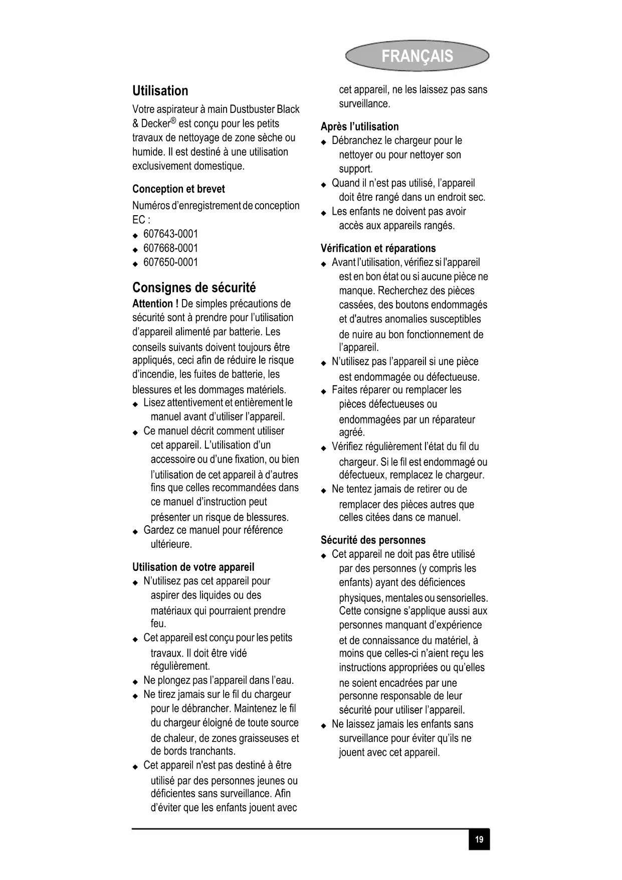 Votre aspirateur a main Dustbuster Black & Decker est conçu pour les petits travaux de nettoyage de zonesèche ou humide. Il est destiné à une utilisation exclusivement domestique.