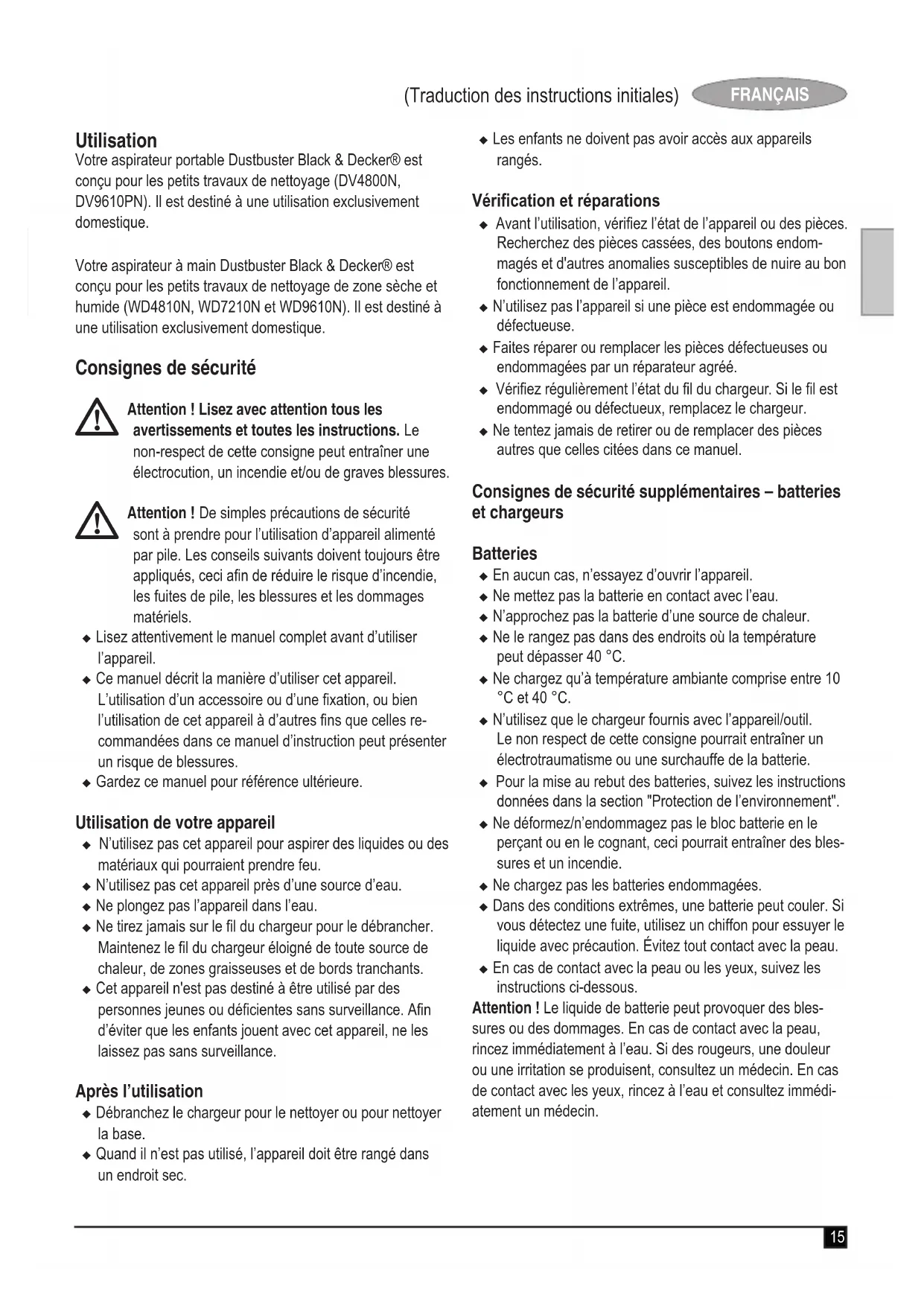 Poids kg 0.17 0.17 0.22 Garantie Black & Decker assure la qualité de ses produits et vous offre une garantie très élargie. Ce certicat de garantie est un docu- ment supplémentaire et ne peut en aucun cas se substituer à vos droits légaux. La garantie est valable sur tout le territoire des États Membres de l'Union Européenne et de la Zone de Libre Échange Européenne. Si un produit Black & Decker s'avère défectueux en raison de matériaux en mauvaises conditions, d'une erreur humaine, ou d'un manque de conformité dans les 24 mois suivant la date d'achat, Black & Decker garantit le remplacement des pièces défectueuses, la réparation des produits usés ou cassés ou remplace ces produits à la convenance du client, sauf dans les circonstances suivantes : u Le produit a été utilisé dans un but commercial, profes- sionnel, ou a été loué; u Le produit a été mal utilisé ou utilisé avec négligence;u Le produit a subi des dommages à cause d'objets étrangers, de substances ou à cause d'accidents; u Des réparations ont été tentées par des techniciens ne faisant pas partie du service technique de Black & Decker. Pour avoir recours à la garantie, il est nécessaire de fournir une preuve d'achat au vendeur ou à un réparateur agréé. Pour connaître l'adresse du réparateur agréé le plus proche de chez vous, contactez le bureau Black & Decker à l'adresse indiquée dans ce manuel. Vous pourrez aussi trouver une liste de réparateurs agréés de Black & Decker et de plus amples détails sur notre service après-vente sur le site Internet à l'adresse suivante : www.2helpU.com Visitez notre site Web www.blackanddecker.fr pour enregistrer votre nouveau produit Black & Decker et être informé des nouveaux produits et des offres spéciales. Pour plus d'informations concernant la marque Black & Decker et notre gamme de produits, consultez notre site www.blackanddecker. fr20 (Traduzione del testo originale) ITALIANO Uso previsto L’aspirapolvere portatile Black & Decker Dustbuster® è stato progettato per la pulizia leggera e a secco (DV4800N, DV9610PN). L'elettrodomestico è stato progettato solo per uso domestico. L’aspirasolidi o aspiraliquidi portatile Black & Decker Dustbuster® è stato progettato per aspirare solidi e liquidi (WD4810N, WD7210Ne WD9610N). L'elettrodomestico è stato progettato solo per uso domestico. Istruzioni di sicurezza