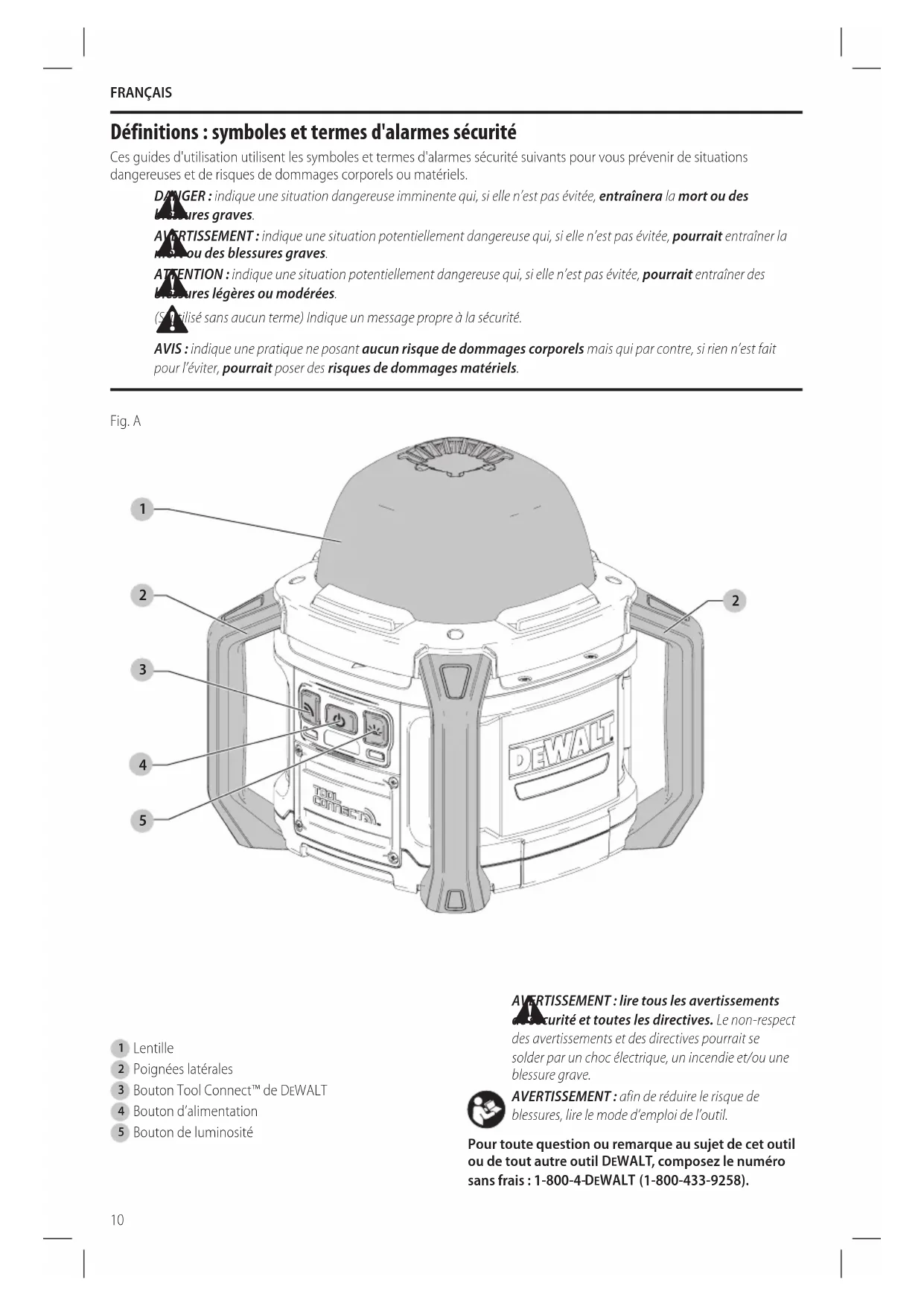 blessures, lire le mode d’emploi del’outil. Pour toute question ou remarque au sujet de cet outil ou de tout autre outil DeWALT , composez le numéro sans frais : 1-800-4- DeWALT (1-800-433-9258).