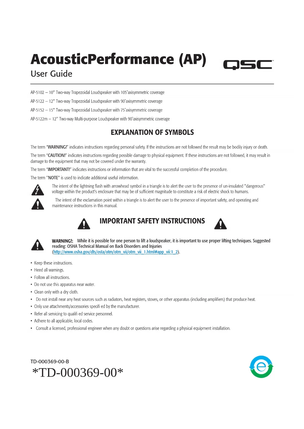 Retrouvez gratuitement la notice de l'appareil AcousticPerformance AP5122m QSC au format PDF.