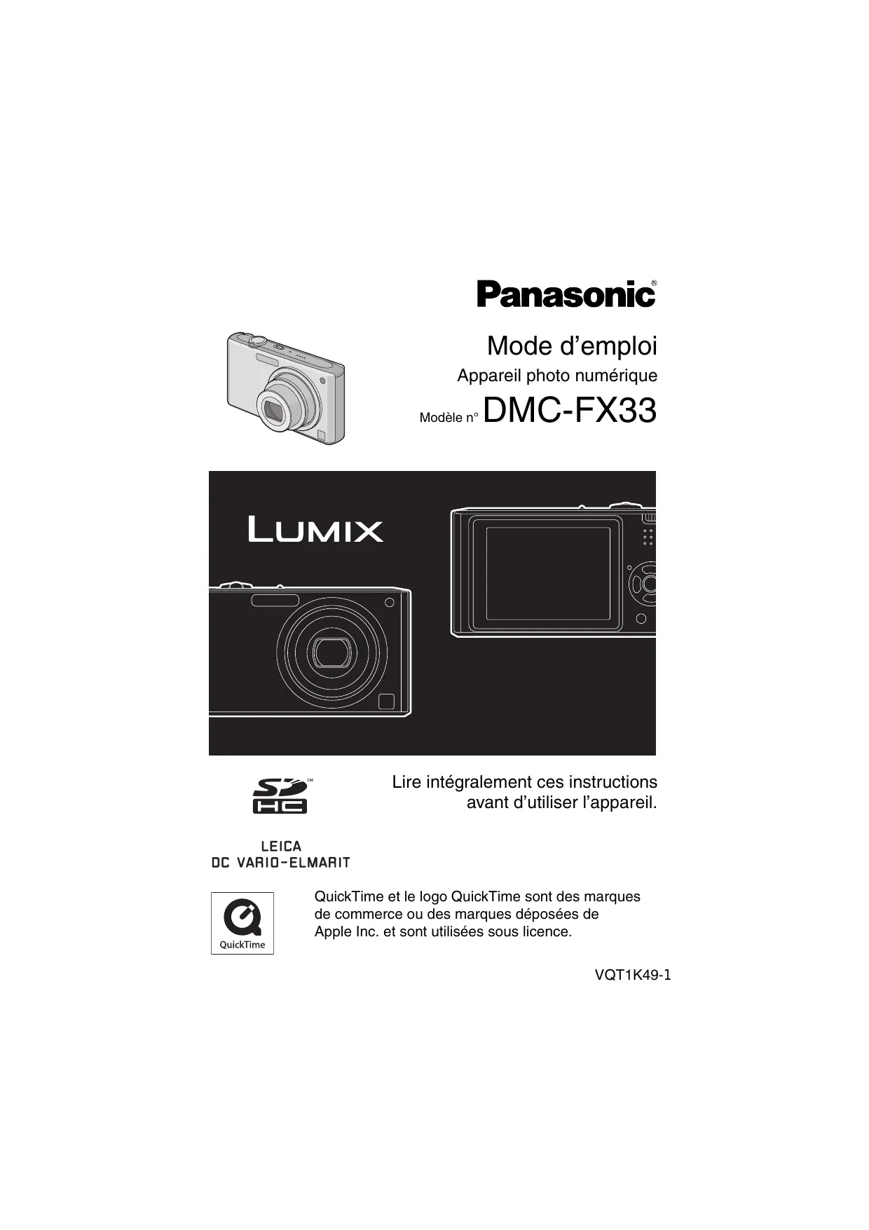 Couverture Mode d’emploi Appareil photo numérique Modèle n° DMC-FX33 Lire intégralement ces instructions avant d’utiliser l’appareil. QuickTime et le logo QuickTime sont des marques de commerce ou des marques déposées de Apple Inc. et sont utilisées sous licence.