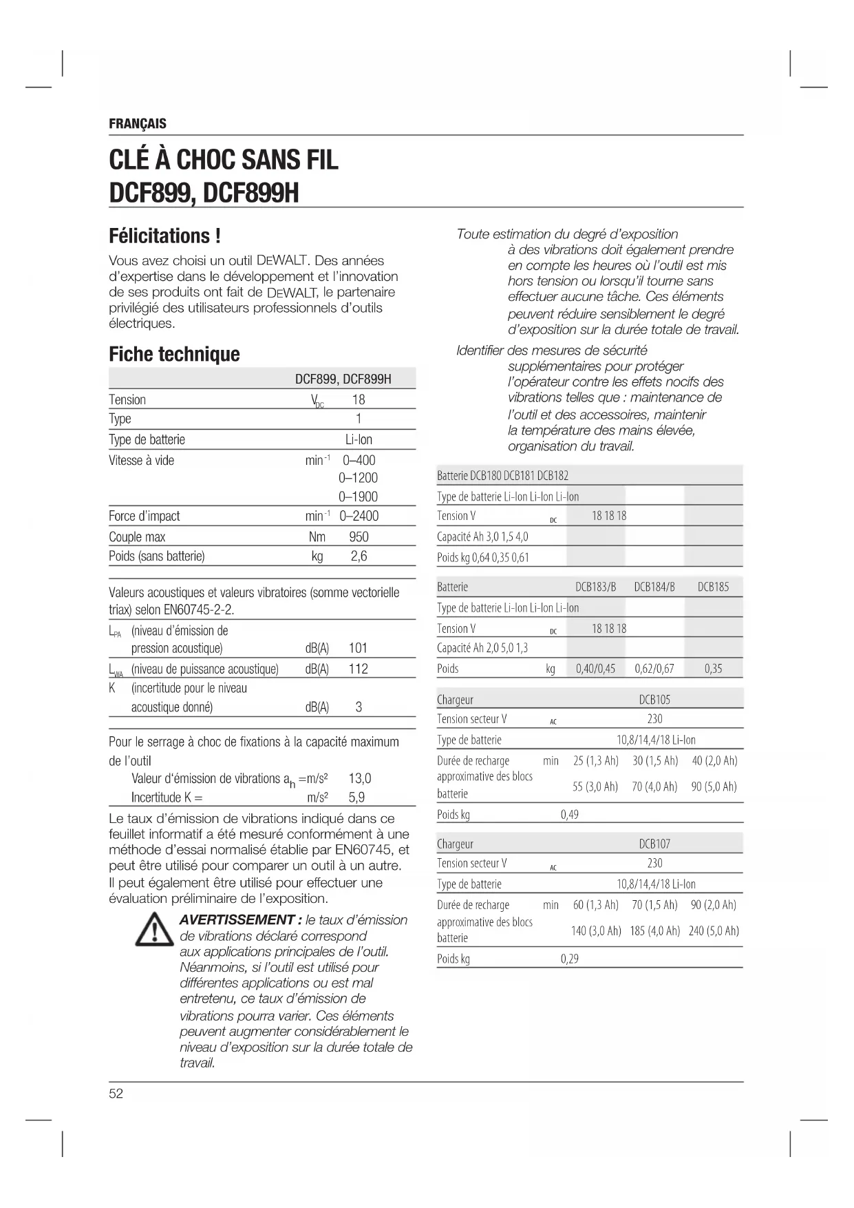 Type de batterie 10,8/14,4/18 Li-Ion Durée de recharge approximative des blocs batterie min 60 (1,3 Ah) 70 (1,5 Ah) 90 (2,0 Ah) 140 (3,0 Ah) 185 (4,0 Ah) 240 (5,0 Ah) Poids kg 0,29 Félicitations! Vous avez choisi un outil DeWALT . Des années d’expertise dans le développement et l’innovation de ses produits ont fait de DeWALT , le partenaire privilégié des utilisateurs professionnels d’outils électriques. Fiche technique