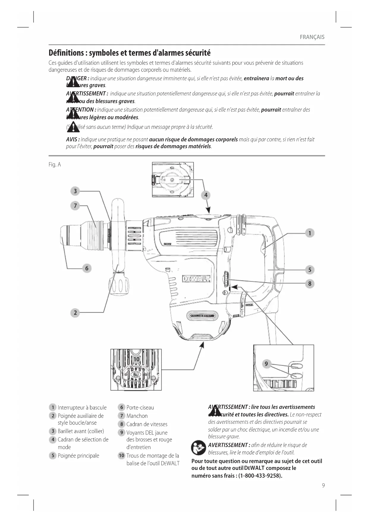blessures, lire le mode d’emploi del’outil. Pour toute question ou remarque au sujet de cet outil ou de tout autre outil DeWALT composez le numéro sans frais : (1-800-433-9258).