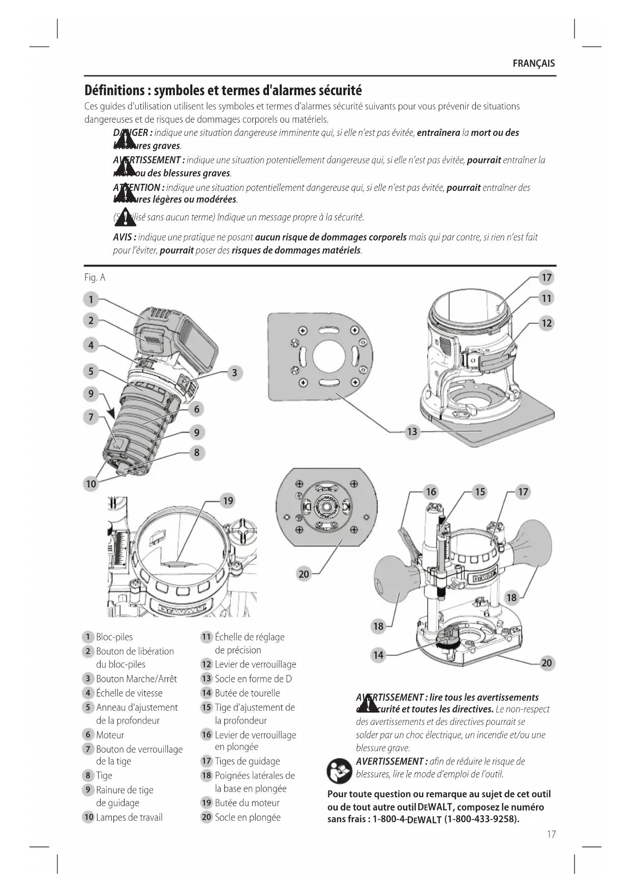 blessures, lire le mode d’emploi del’outil. Pour toute question ou remarque au sujet de cet outil ou de tout autre outil DeWALT , composez le numéro sans frais : 1-800-4- DeWALT (1-800-433-9258). Français (traduction de la notice d’instructions originale)