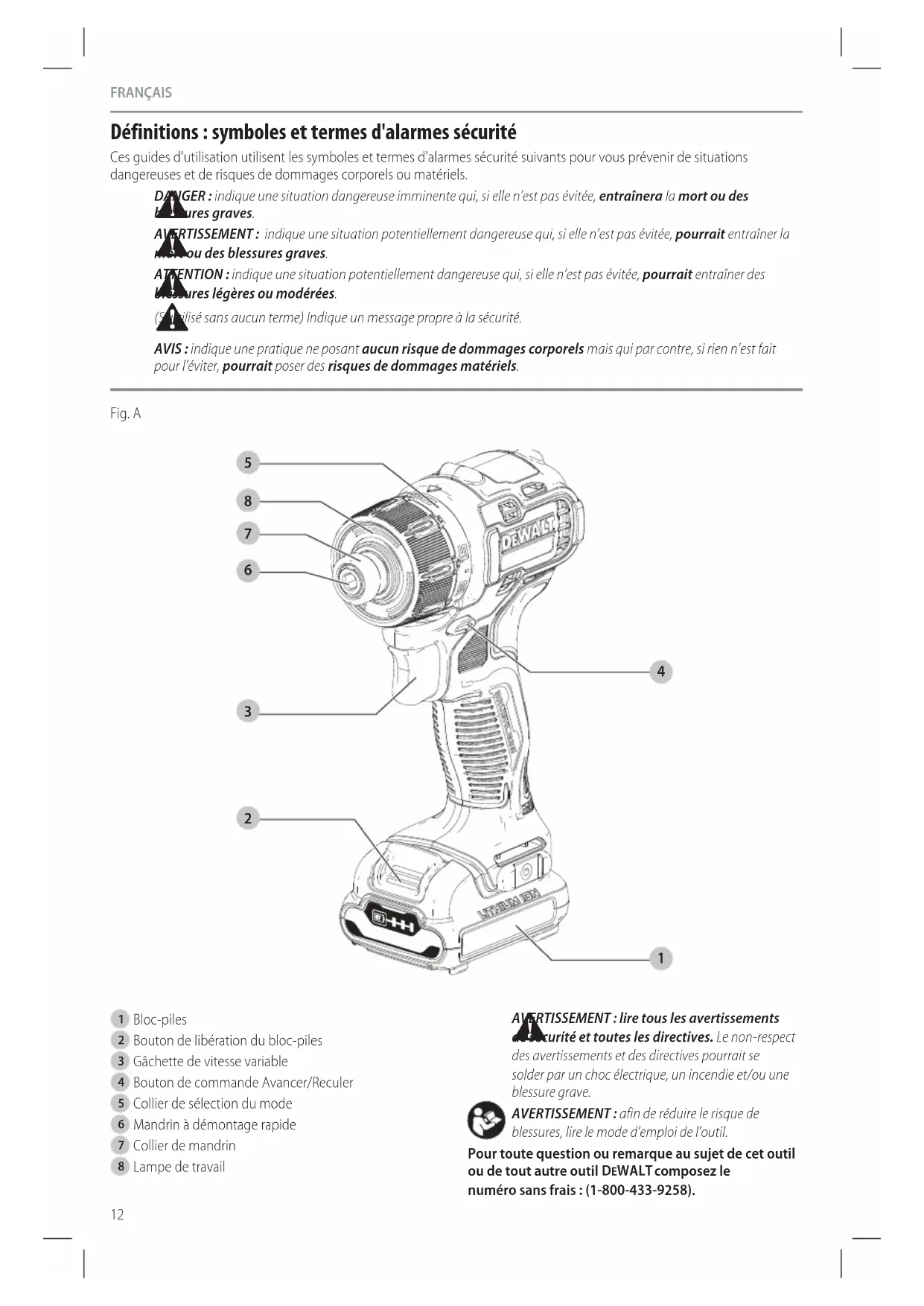 blessures, lire le mode d’emploi del’outil. Pour toute question ou remarque au sujet de cet outil ou de tout autre outil DeWALT composez le numéro sans frais : (1-800-433-9258). Fig. A