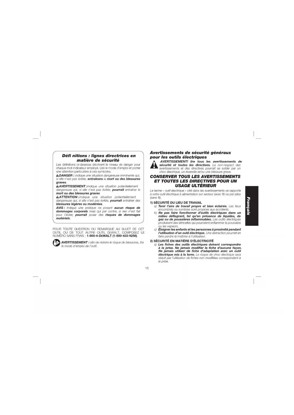 Product warranty voided if the battery pack is tampered with in any way. D EWALT is not responsible for any injury caused by tampering and may prosecute warranty fraud to the fullest extent permitted by law. English 14Défi nitions: lignes directrices en matière de sécurité Les définitions ci-dessous décrivent le niveau de danger pour chaque mot-indicateur employé. Lire le mode d’emploi et porter une attention particulière à ces symboles.