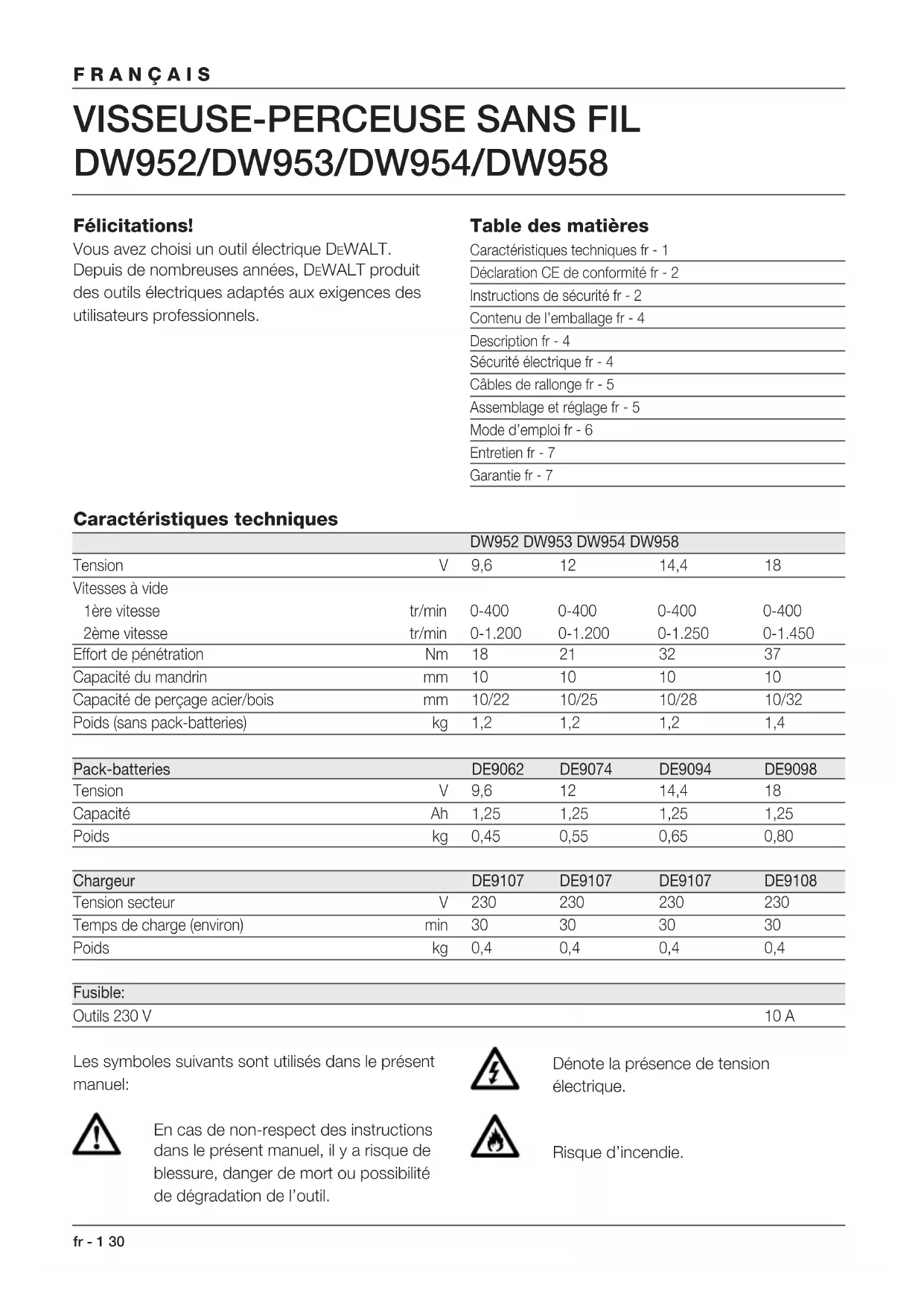 DW952/DW953/DW954/DW958 Félicitations! Vous avez choisi un outil électrique DEWALT. Depuis de nombreuses années, DEWALT produit des outils électriques adaptés aux exigences des utilisateurs professionnels. Table des matières Caractéristiques techniques fr - 1 Déclaration CE de conformité fr - 2 Instructions de sécurité fr - 2 Contenu de l’emballage fr - 4 Description fr - 4 Sécurité électrique fr - 4 Câbles de rallonge fr - 5 Assemblage et réglage fr - 5 Mode d’emploi fr - 6 Entretien fr - 7 Garantie fr - 7 Caractéristiques techniques DW952 DW953 DW954 DW958 Tension V 9,6 12 14,4 18 Vitesses à vide 1ère vitesse tr/min 0-400 0-400 0-400 0-400 2ème vitesse tr/min 0-1.200 0-1.200 0-1.250 0-1.450 Effort de pénétration Nm 18 21 32 37 Capacité du mandrin mm 10 10 10 10 Capacité de perçage acier/bois mm 10/22 10/25 10/28 10/32 Poids (sans pack-batteries) kg 1,2 1,2 1,2 1,4 Pack-batteries DE9062 DE9074 DE9094 DE9098 Tension V 9,6 12 14,4 18 Capacité Ah 1,25 1,25 1,25 1,25 Poids kg 0,45 0,55 0,65 0,80 Chargeur DE9107 DE9107 DE9107 DE9108 Tension secteur V 230 230 230 230 Temps de charge (environ) min 30 30 30 30 Poids kg 0,4 0,4 0,4 0,4 Fusible: Outils 230 V 10 A Les symboles suivants sont utilisés dans le présent manuel: En cas de non-respect des instructions dans le présent manuel, il y a risque de blessure, danger de mort ou possibilité de dégradation de l’outil. Dénote la présence de tension électrique. Risque d’incendie.FRANÇAIS 31 fr - 2 Déclaration CE de conformité DW952/DW953/DW954/DW958 DEWALT déclare que ces outils ont été mis au point en conformité avec les normes 89/392/CEE, 89/336/CEE, 73/23/CEE, EN 50144, EN 55104 / EN 55014-2, EN 55014, EN 61000-3-2 & EN 61000-3-3. Pour de plus amples informations, contacter DEWALT à l’adresse ci-dessous ou se reporter au dos de ce manuel. Niveau de pression acoustique suivant 86/188/CEE & 89/392/CEE, mesuré suivant EN 50144: DW952 DW953 DW954 DW958