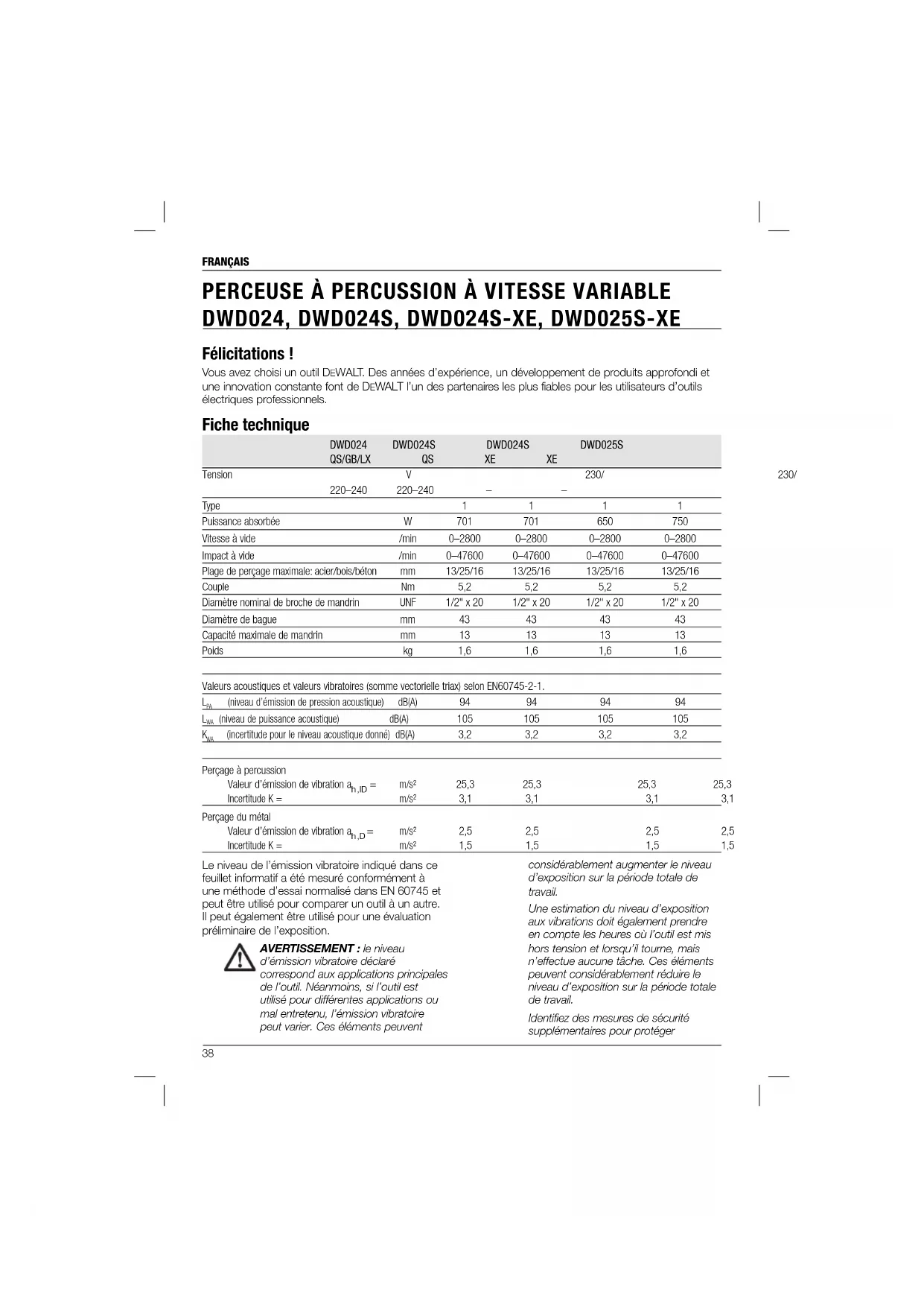 DWD024, DWD024S, DWD024S-XE, DWD025S-XE Le niveau de l’émission vibratoire indiqué dans ce feuillet informatif a été mesuré conformément à une méthode d’essai normalisé dans EN60745 et peut être utilisé pour comparer un outil à un autre. Il peut également être utilisé pour une évaluation préliminaire de l’exposition.