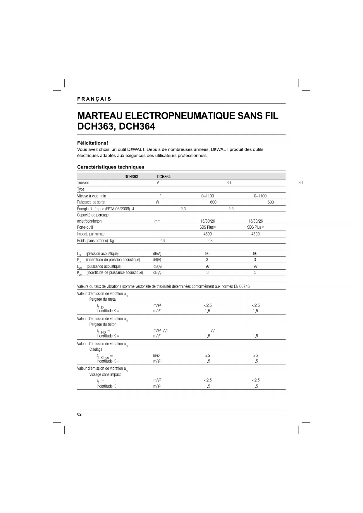 DCH363, DCH364 Félicitations! Vous avez choisi un outil DEWALT. Depuis de nombreuses années, DEWALT produit des outils électriques adaptés aux exigences des utilisateurs professionnels. Caractéristiques techniques DCH363 DCH364 Tension V 36 36 Type 1 1 Vitesse à vide min